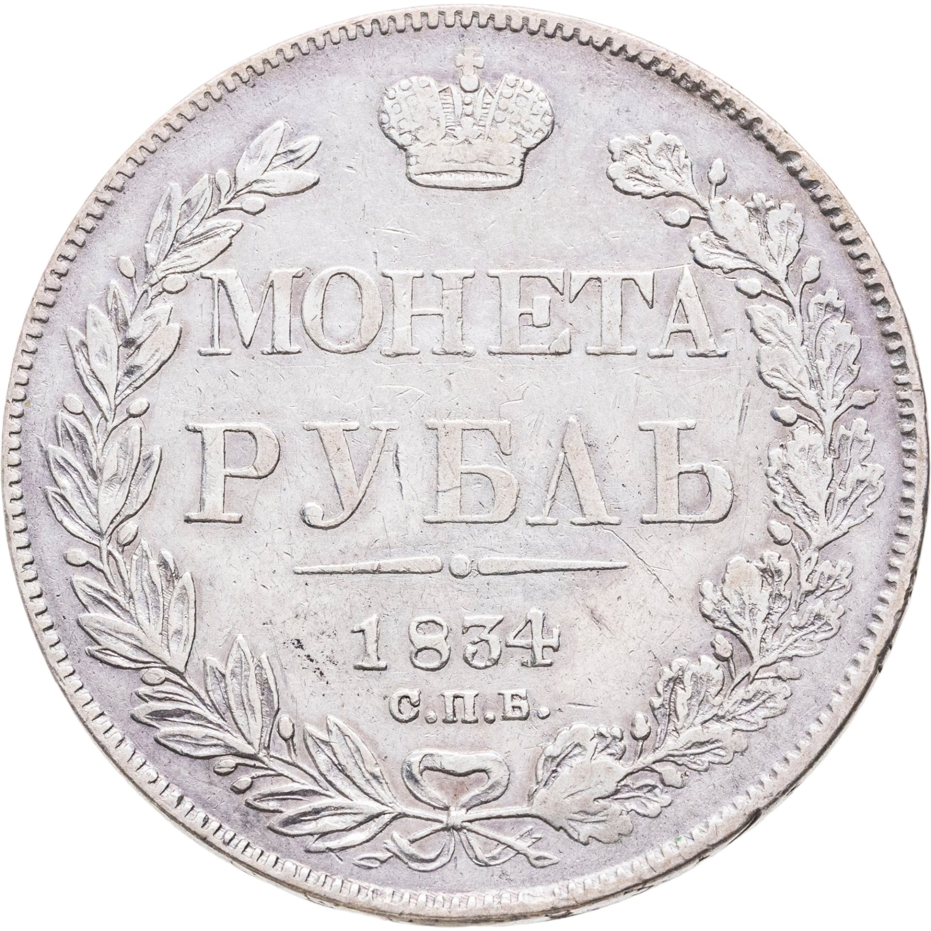 В центре указан номинал «МОНЕТА РУБЛЬ» в две строки. Над номиналом – Корона Российской империи. Под номиналом расположен декоративный разделитель в виде двух разнонаправленных фигурных линий и небольшой окружности между ними, в центре которой, выпуклая точка. Под разделителем — дата выпуска монеты «1834». Под цифрой даты — обозначение монетного двора «С.П.Б.». Вдоль канта, не доходя до короны, изображен венок из лавровой и дубовой ветви, которые в нижней части перевязаны лентой на узел бантом. По окружности канта имеются рельефные элементы, выполненные в виде зубцов.