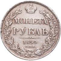 В центре указан номинал «МОНЕТА РУБЛЬ» в две строки. Над номиналом – Корона Российской империи. Под номиналом расположен декоративный разделитель в виде двух разнонаправленных фигурных линий и небольшой окружности между ними, в центре которой, выпуклая точка. Под разделителем — дата выпуска монеты «1840». Под цифрой даты — обозначение монетного двора «С.П.Б.». Вдоль канта, не доходя до короны, изображен венок из лавровой и дубовой ветви, которые в нижней части перевязаны лентой на узел бантом. По окружности канта имеются рельефные элементы, выполненные в виде зубцов.
