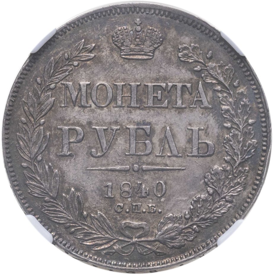 В центре указан номинал «МОНЕТА РУБЛЬ» в две строки. Над номиналом – Корона Российской империи. Под номиналом расположен декоративный разделитель в виде двух разнонаправленных фигурных линий и небольшой окружности между ними, в центре которой, выпуклая точка. Под разделителем — дата выпуска монеты «1840». Под цифрой даты — обозначение монетного двора «С.П.Б.». Вдоль канта, не доходя до короны, изображен венок из лавровой и дубовой ветви, которые в нижней части перевязаны лентой на узел бантом. По окружности канта имеются рельефные элементы, выполненные в виде зубцов.