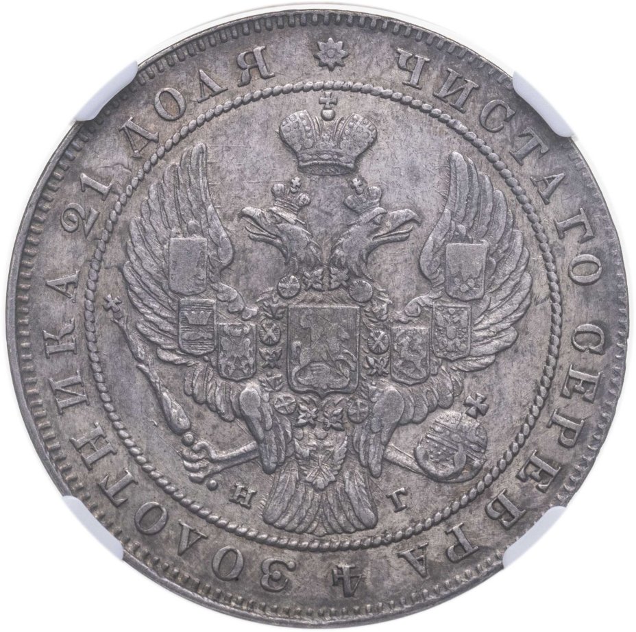 В центре изображен Государственный Герб Российской империи - двуглавый орёл, головы которого увенчаны двумя коронами, третья, большая корона над ними. На груди орла расположен Московский герб - щит с изображением Георгия Победоносца, поражающего копьем дракона. Вокруг щита орденская цепь с орденом Св. Апостола Андрея Первозванного. На крыльях изображены титульные гербы: на правом — Казанский, Астраханский и Сибирский, на левом — Польский, Таврический и Финляндский. В правой лапе орла – скипетр, в левой – держава. Под правой лапой – буква «Н», под левой – буква «Г». Инициалы минцмейстера Николая Грачева. Центральная часть отделена от остального изображения, окружностью в виде точек. За окружностью круговая надпись: «ЧИСТАГО СЕРЕБРА 4 ЗОЛОТНИКА 21 ДОЛЯ», разделенная сверху цветочной розеткой. По окружности канта имеются рельефные элементы, выполненные в виде зубцов.