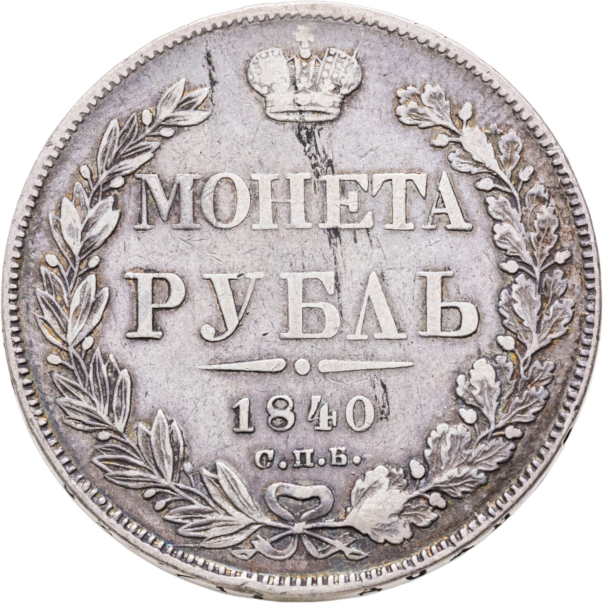 В центре указан номинал «МОНЕТА РУБЛЬ» в две строки. Над номиналом – Корона Российской империи. Под номиналом расположен декоративный разделитель в виде двух разнонаправленных фигурных линий и небольшой окружности между ними, в центре которой, выпуклая точка. Под разделителем — дата выпуска монеты «1840». Под цифрой даты — обозначение монетного двора «С.П.Б.». Вдоль канта, не доходя до короны, изображен венок из лавровой и дубовой ветви, которые в нижней части перевязаны лентой на узел бантом. По окружности канта имеются рельефные элементы, выполненные в виде зубцов.
