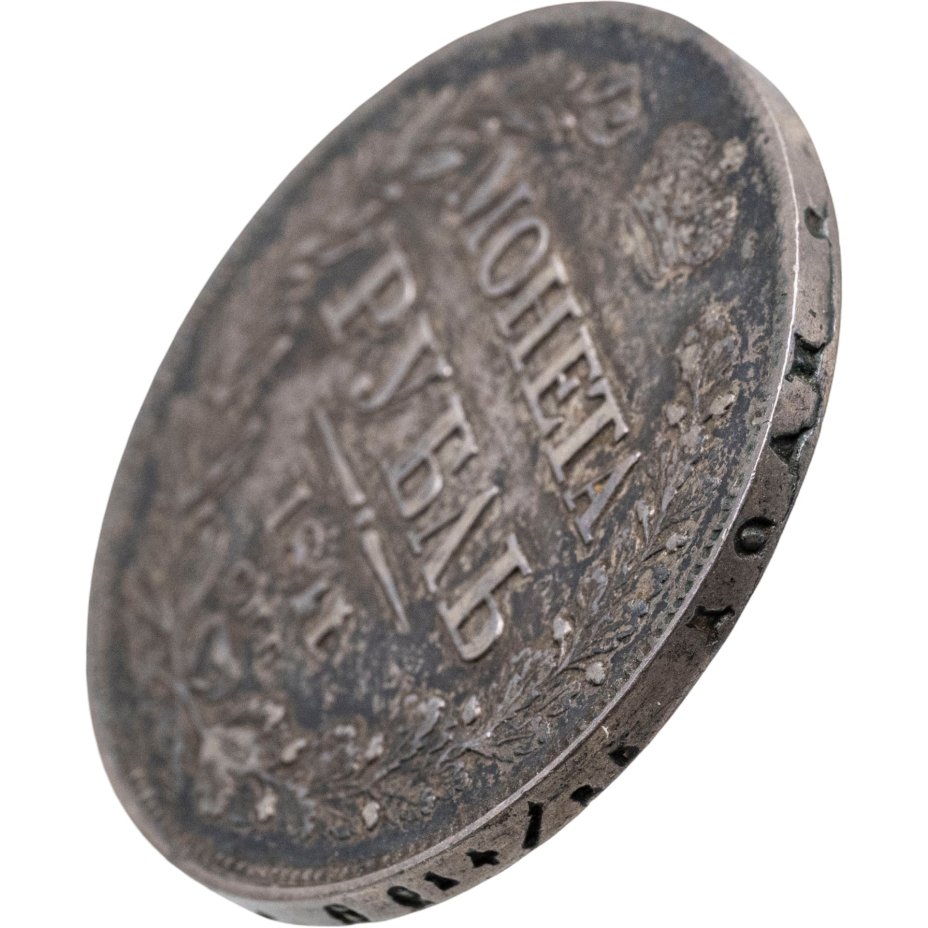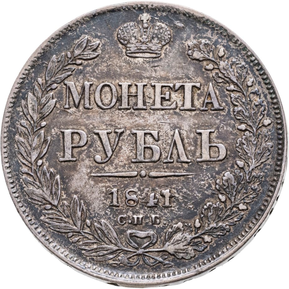В центре указан номинал «МОНЕТА РУБЛЬ» в две строки. Над номиналом – Корона Российской империи. Под номиналом расположен декоративный разделитель в виде двух разнонаправленных фигурных линий и небольшой окружности между ними, в центре которой, выпуклая точка. Под разделителем — дата выпуска монеты «1841». Под цифрой даты — обозначение монетного двора «С.П.Б.». Вдоль канта, не доходя до короны, изображен венок из лавровой и дубовой ветви, которые в нижней части перевязаны лентой на узел бантом. По окружности канта имеются рельефные элементы, выполненные в виде зубцов.