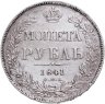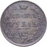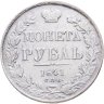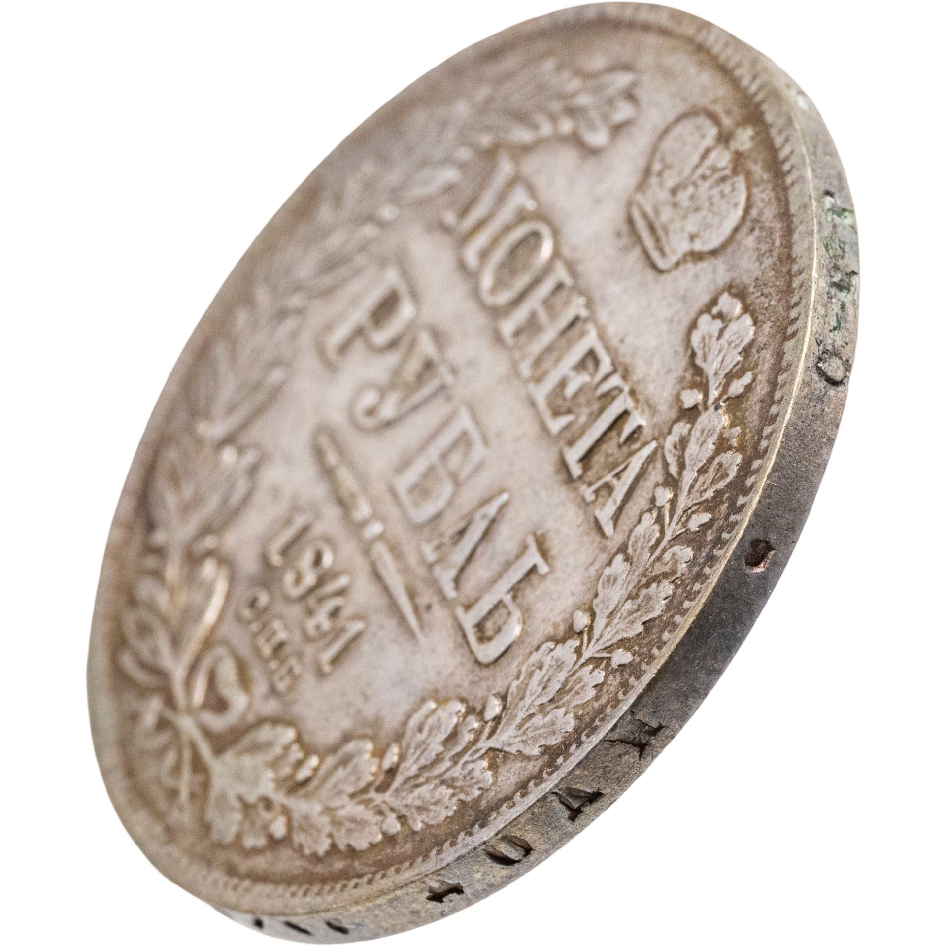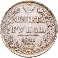 В центре указан номинал «МОНЕТА РУБЛЬ» в две строки. Над номиналом – Корона Российской империи. Под номиналом расположен декоративный разделитель в виде двух разнонаправленных фигурных линий и небольшой окружности между ними, в центре которой, выпуклая точка. Под разделителем — дата выпуска монеты «1841». Под цифрой даты — обозначение монетного двора «С.П.Б.». Вдоль канта, не доходя до короны, изображен венок из лавровой и дубовой ветви, которые в нижней части перевязаны лентой на узел бантом. По окружности канта имеются рельефные элементы, выполненные в виде зубцов.