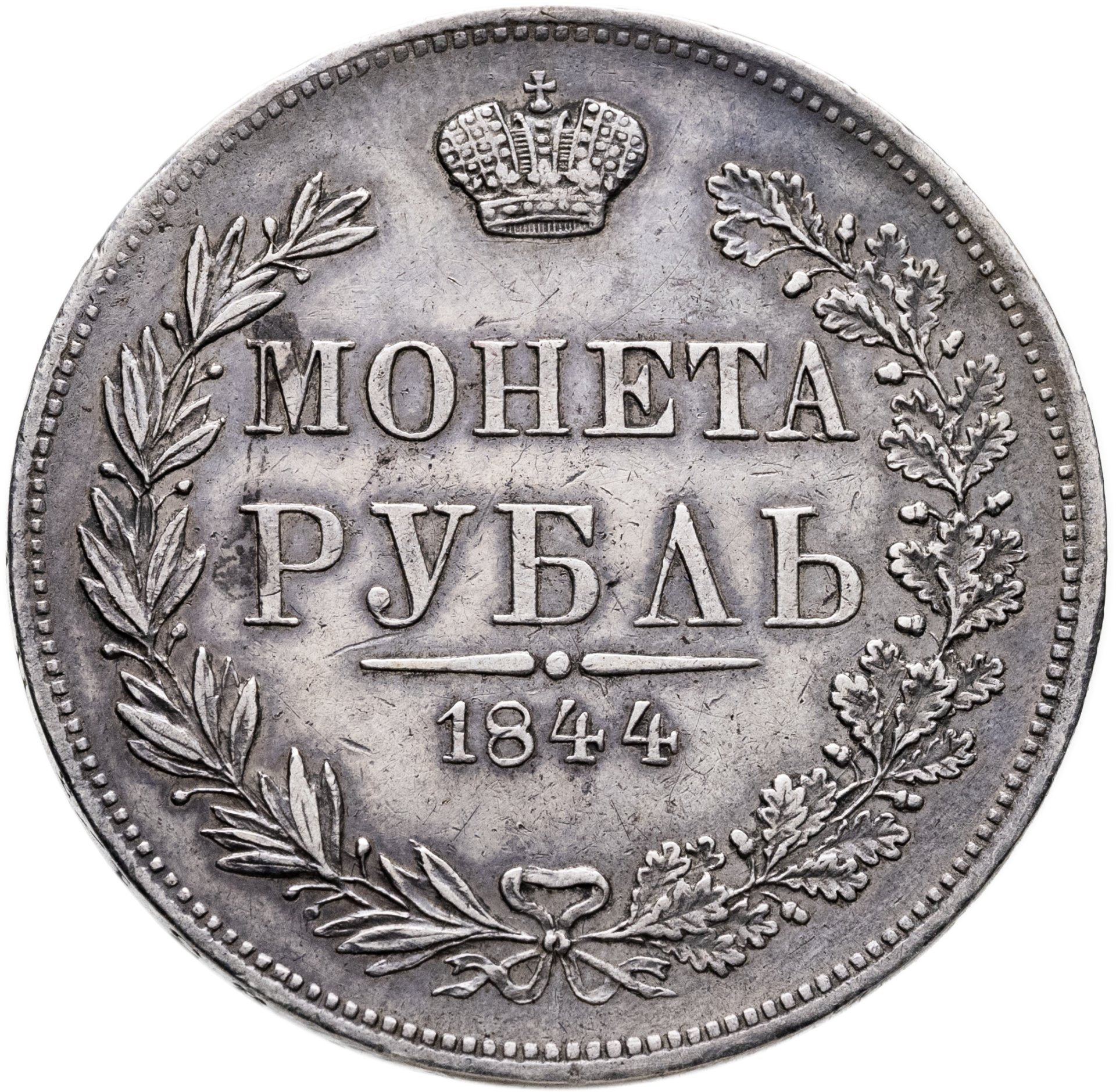 В центре указан номинал «МОНЕТА РУБЛЬ» в две строки. Над номиналом – Корона Российской империи. Под номиналом расположен декоративный разделитель в виде двух разнонаправленных фигурных линий и небольшой окружности между ними, в центре которой, выпуклая точка. Под разделителем — дата выпуска монеты «1844». Вдоль канта, не доходя до короны, изображен венок из лавровой и дубовой ветви, которые в нижней части перевязаны лентой на узел бантом. По окружности канта имеются рельефные элементы, выполненные в виде зубцов.