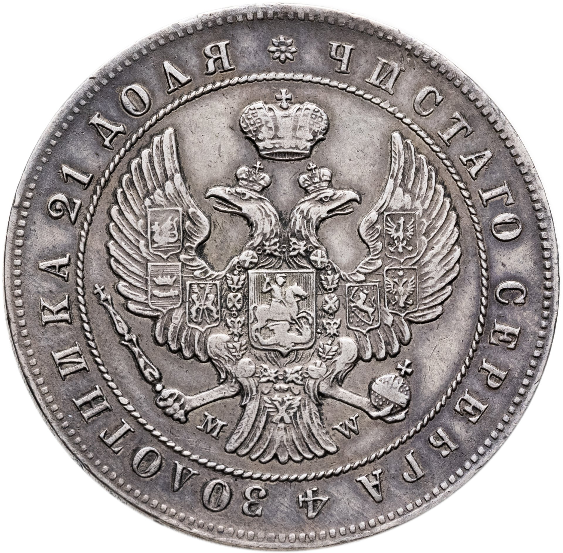 В центре изображен Государственный Герб Российской империи - двуглавый орёл, головы которого увенчаны двумя коронами, третья, большая корона над ними. На груди орла расположен Московский герб - щит с изображением Георгия Победоносца, поражающего копьем дракона. Вокруг щита орденская цепь с орденом Св. Апостола Андрея Первозванного. На крыльях изображены титульные гербы: на правом — Казанский, Астраханский и Сибирский, на левом — Польский, Таврический и Финляндский. В правой лапе орла – скипетр, в левой – держава. Под правой лапой – буква «M», под левой – буква «W». Обозначение Варшавского монетного двора. Центральная часть отделена от остального изображения, окружностью в виде точек. За окружностью круговая надпись: «ЧИСТОГО СЕРЕБРА 4 ЗОЛОТНИКА 21 ДОЛЯ», разделенная сверху цветочной розеткой. По окружности канта имеются рельефные элементы, выполненные в виде зубцов.