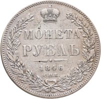 В центре указан номинал «МОНЕТА РУБЛЬ» в две строки. Над номиналом – Корона Российской империи. Под номиналом расположен декоративный разделитель в виде двух разнонаправленных фигурных линий и небольшой окружности между ними, в центре которой, выпуклая точка. Под разделителем — дата выпуска монеты «1846». Под цифрой даты — обозначение монетного двора «С.П.Б.». Вдоль канта, не доходя до короны, изображен венок из лавровой и дубовой ветви, которые в нижней части перевязаны лентой на узел бантом. По окружности канта имеются рельефные элементы, выполненные в виде зубцов.