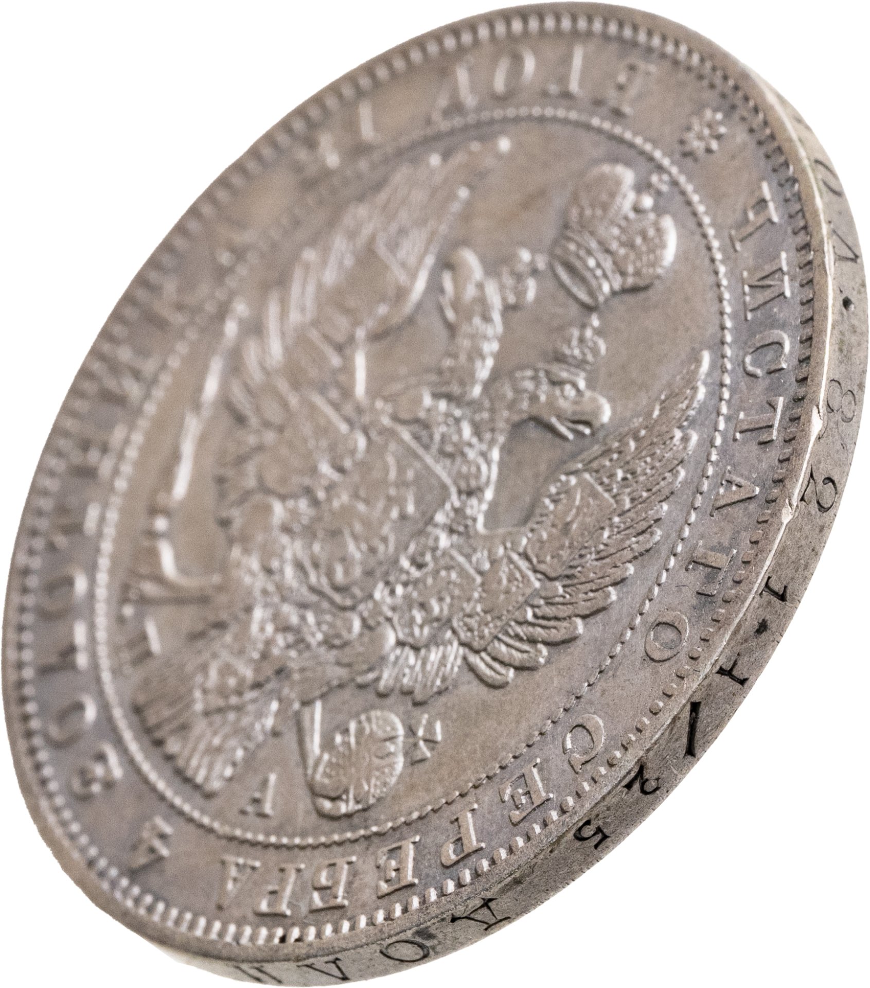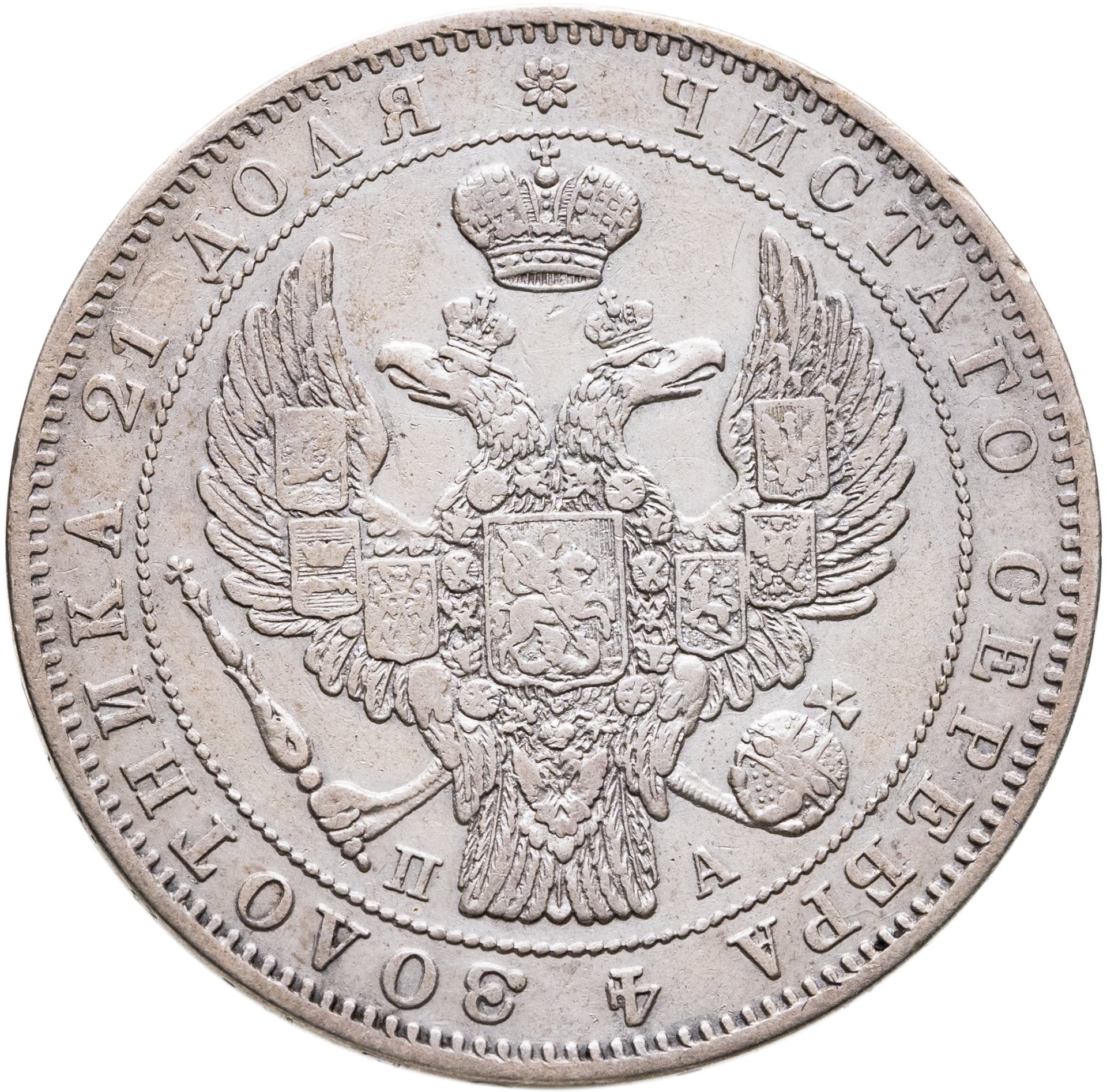 В центре изображен Государственный Герб Российской империи - двуглавый орёл, головы которого увенчаны двумя коронами, третья, большая корона над ними. На груди орла расположен Московский герб - щит с изображением Георгия Победоносца, поражающего копьем дракона. Вокруг щита орденская цепь с орденом Св. Апостола Андрея Первозванного. На крыльях изображены титульные гербы: на правом — Казанский, Астраханский и Сибирский, на левом — Польский, Таврический и Финляндский. В правой лапе орла – скипетр, в левой – держава. Под правой лапой – буква «П», под левой – буква «А». Инициалы минцмейстера Павла Алексеева. Центральная часть отделена от остального изображения, окружностью в виде точек. За окружностью круговая надпись: «ЧИСТОГО СЕРЕБРА 4 ЗОЛОТНИКА 21 ДОЛЯ», разделенная сверху цветочной розеткой. По окружности канта имеются рельефные элементы, выполненные в виде зубцов.