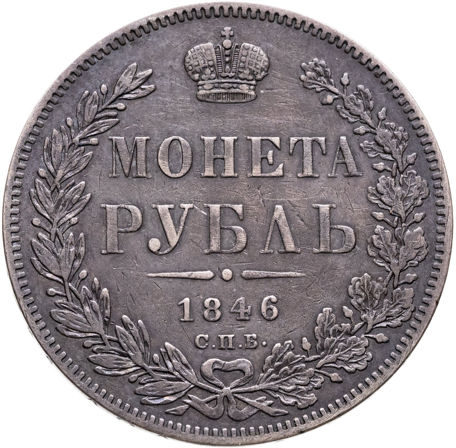 В центре указан номинал «МОНЕТА РУБЛЬ» в две строки. Над номиналом – Корона Российской империи. Под номиналом расположен декоративный разделитель в виде двух разнонаправленных фигурных линий и небольшой окружности между ними, в центре которой, выпуклая точка. Под разделителем — дата выпуска монеты «1846». Под цифрой даты — обозначение монетного двора «С.П.Б.». Вдоль канта, не доходя до короны, изображен венок из лавровой и дубовой ветви, которые в нижней части перевязаны лентой на узел бантом. По окружности канта имеются рельефные элементы, выполненные в виде зубцов.