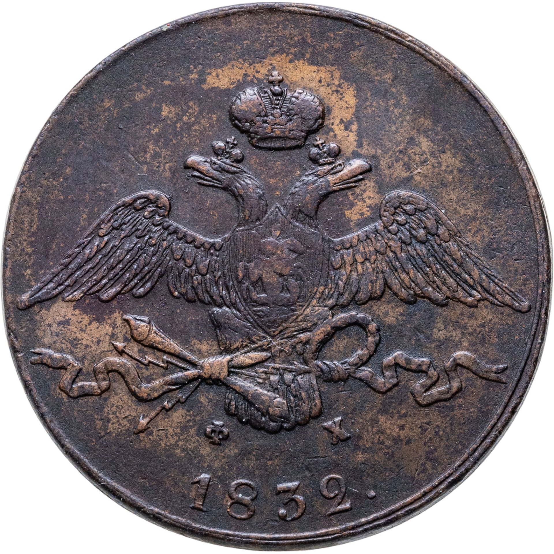 В центре изображен Государственный Герб Российской империи - двуглавый орёл с распростёртыми и опущенными вниз крыльями. Над головами орла - императорская корона. На груди орла расположен Московский герб - щит с изображением Георгия Победоносца, поражающего копьем дракона. Орёл держит, перевитые орденской лентой ордена Св. Апостола Андрея Первозванного, громовые стрелы и факел в правой лапе и лавровый венок — в левой. Под лентой буквы: слева «Ф», справа «Х». Инициалы минцмейстера Федора Хвощинского. Под инициалами — дата выпуска монеты «1832.»