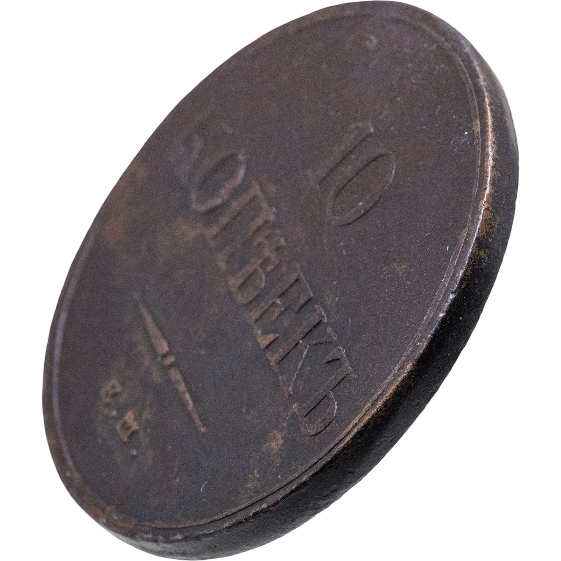 В центре указан номинал «10». Под цифрой номинала — слово "КОПЕЕК". Ниже, расположен декоративный разделитель в виде двух разнонаправленных линий и небольшой точки между ними. Ниже, под разделителем — обозначение монетного двора «Е.М.».