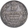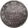 В центре указан номинал «10». Над цифрой – Корона Российской империи. Под цифрой номинала — слово "КОПЕЕК". Ниже, расположен декоративный разделитель в виде двух разнонаправленных фигурных линий и небольшой окружности между ними, в центре которой, выпуклая точка. Под разделителем — дата выпуска монеты «1839». Под цифрой даты — обозначение монетного двора «С.П.Б.». Вдоль канта, не доходя до короны, изображен венок из лавровой и дубовой ветви, которые в нижней части перевязаны лентой на узел бантом. По окружности канта имеются рельефные элементы, выполненные в виде зубцов.