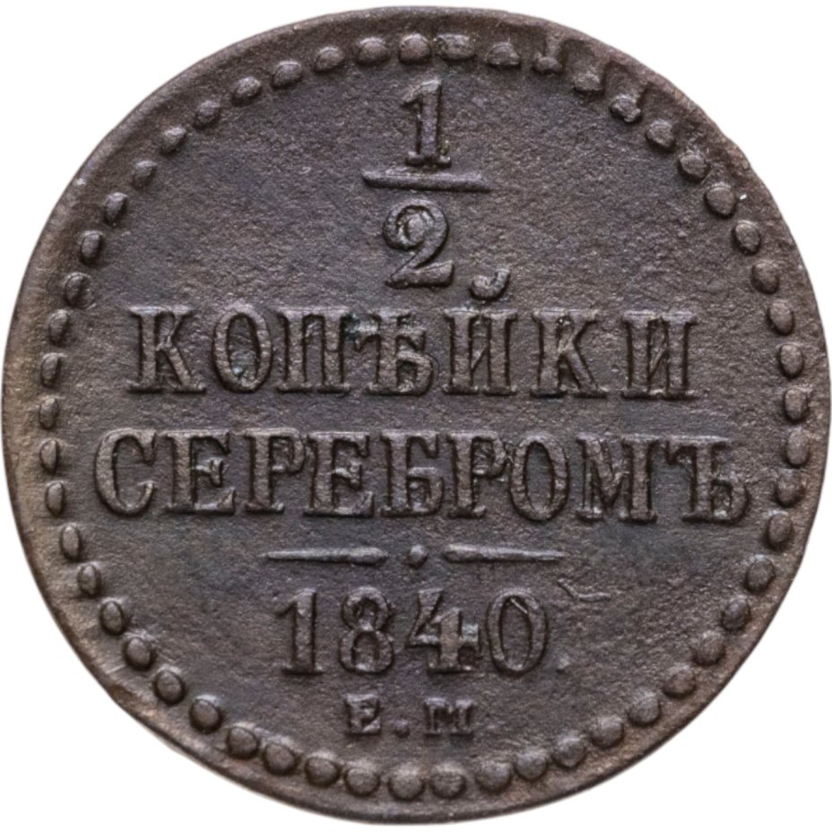 В центре надпись в две строки: «КОПѢЙКИ»│«СЕРЕБРОМЪ». Над надписью обозначение номинала — цифра «1/2». Под надписью расположен декоративный разделитель в виде двух фигурных линий и небольшой точки между ними. Под разделителем — год выпуска монеты «1840.». Ниже, обозначение монетного двора — буквы «Е.М.». По окружности канта имеются рельефные элементы, выполненные в виде точек.