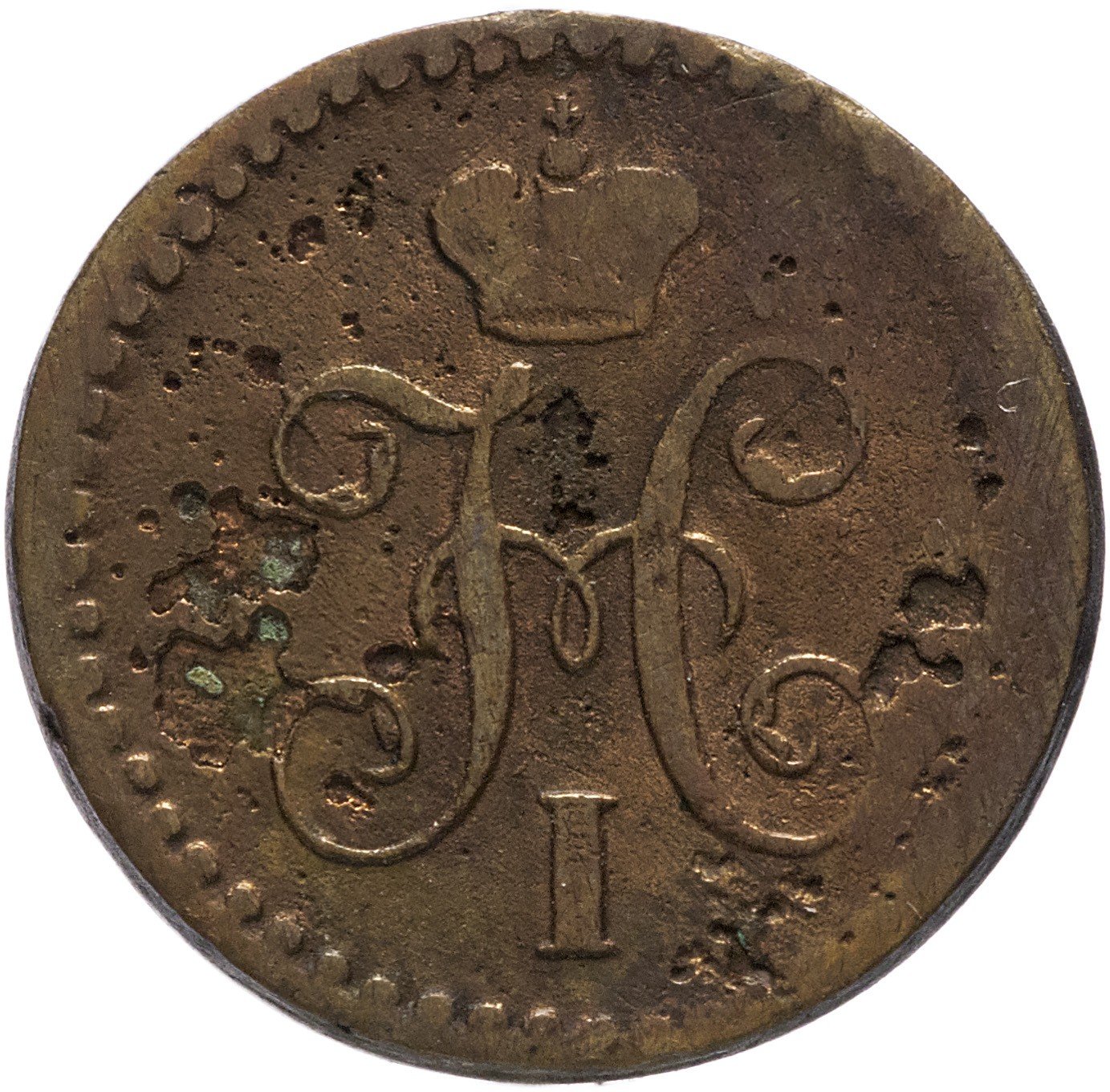 В центре вензель Николая I. Над ним Корона Российской империи. По окружности канта имеются рельефные элементы, выполненные в виде точек.