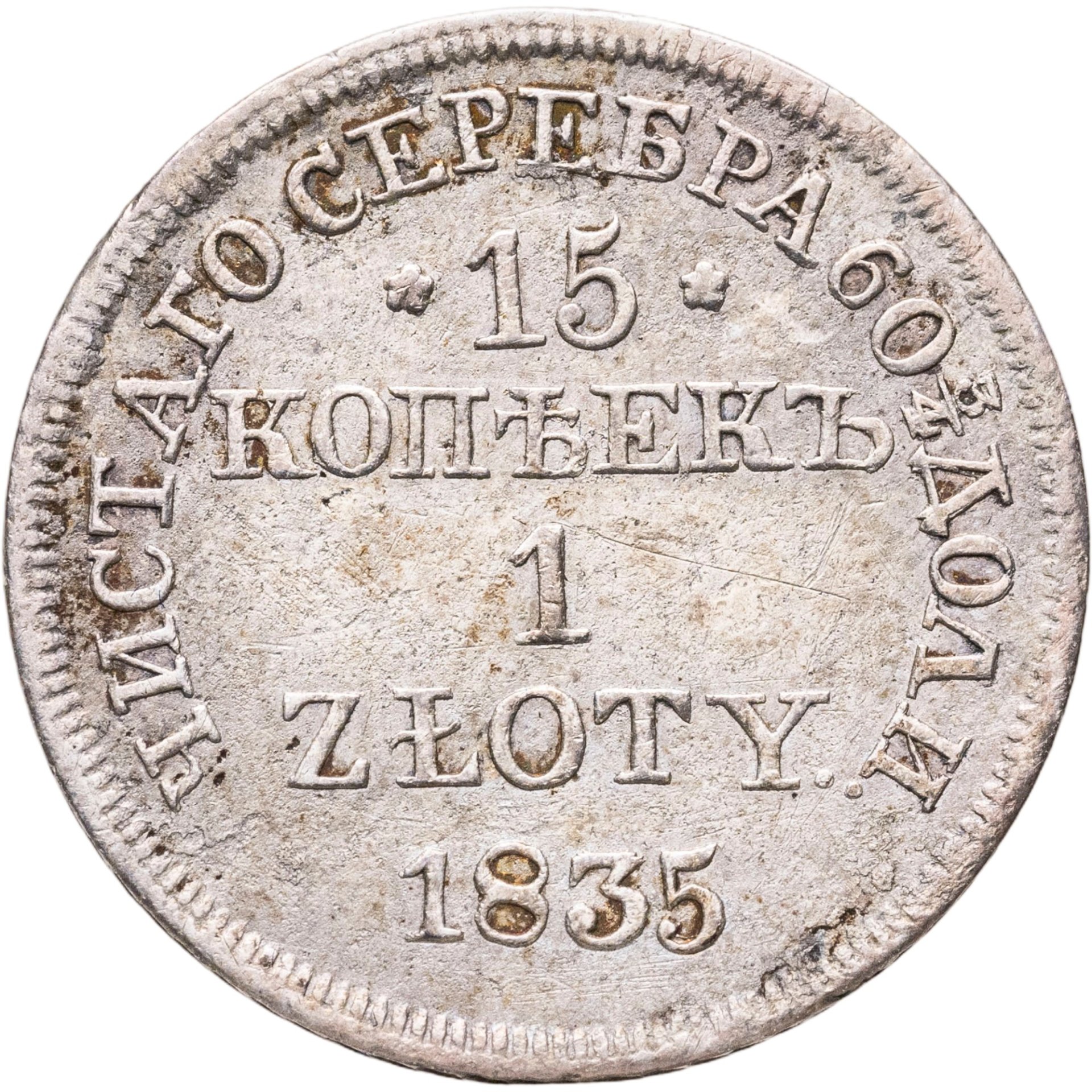 В центре надпись в четыре строки: «15»│«КОПѢЕКЪ»│«1»│«ZLOTY.». Цифра «15» ограниченна с обеих сторон цветочными розетками. Под надписью дата выпуска — «1835». Вдоль канта надпись: «ЧИСТАГО СЕРЕБРА 60 3/4 ДОЛИ.». По окружности канта имеются рельефные элементы, выполненные в виде зубцов.