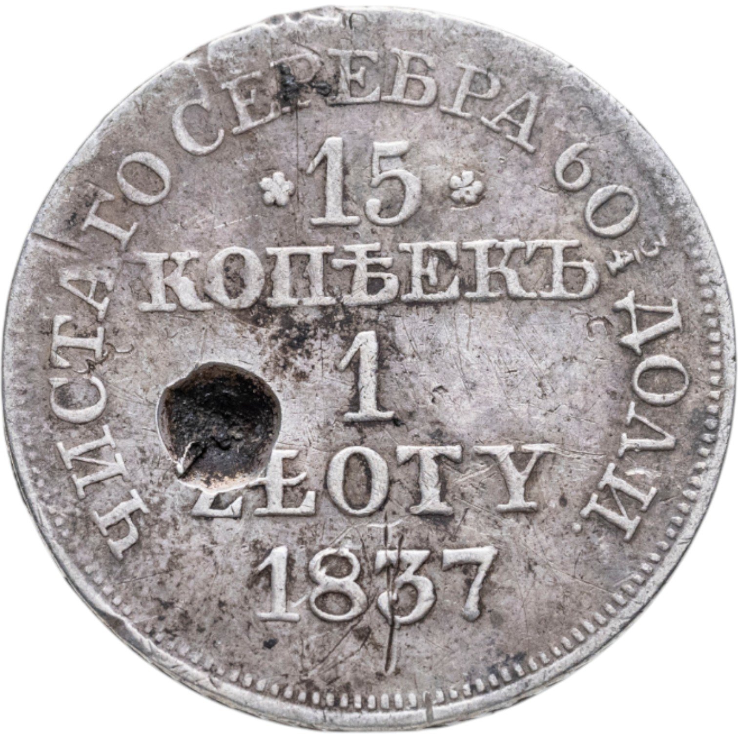 В центре надпись в четыре строки: «15»│«КОПѢЕКЪ»│«1»│«ZLOTY.». Цифра «15» ограниченна с обеих сторон цветочными розетками. Под надписью дата выпуска — «1837.». Вдоль канта надпись: «ЧИСТАГО СЕРЕБРА 60 3/4 ДОЛИ.». По окружности канта имеются рельефные элементы, выполненные в виде зубцов.