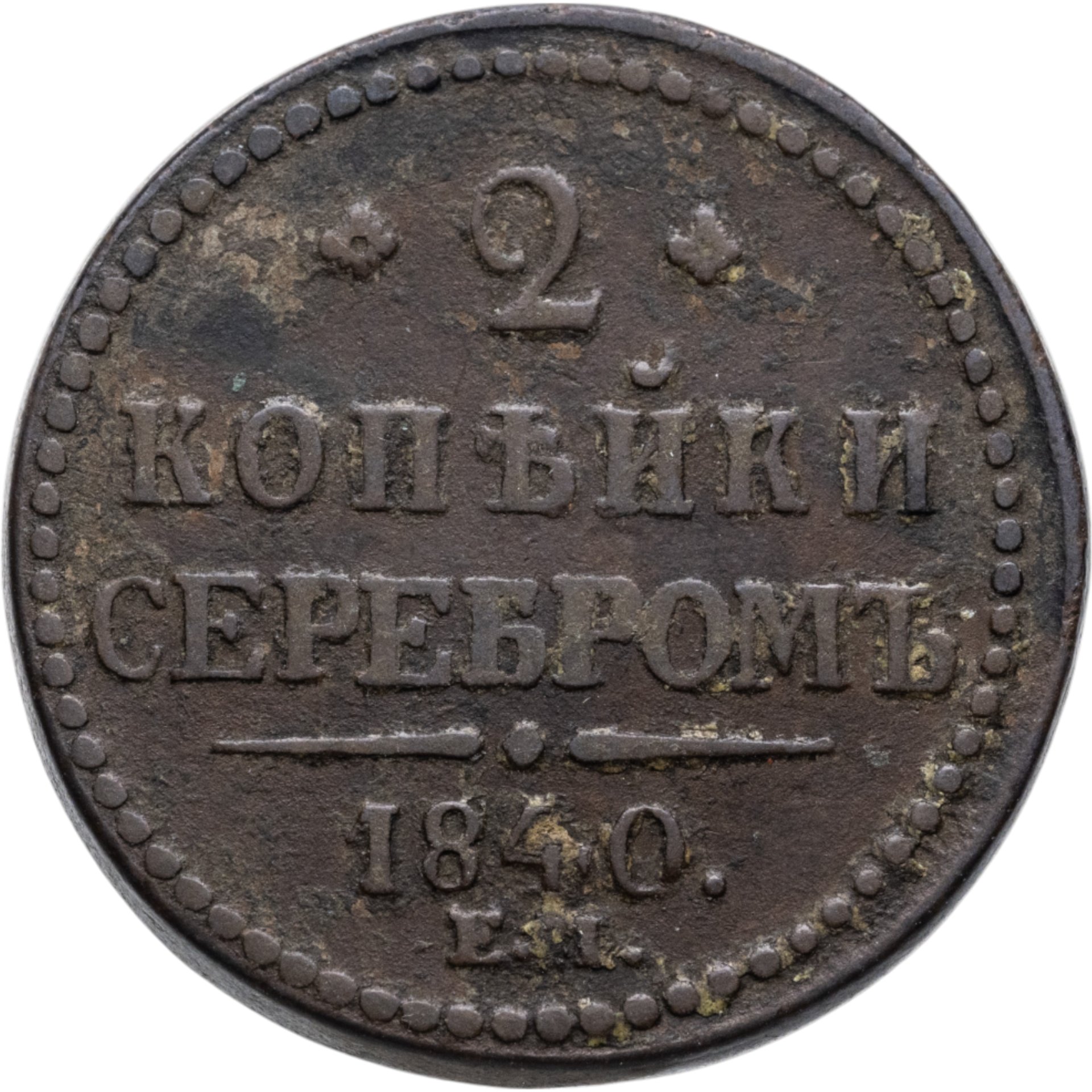 В центре надпись в две строки: «КОПѢЙКИ»│«СЕРЕБРОМЪ». Над надписью обозначение номинала — цифра «2», ограниченная с обеих сторон цветочными розетками. Под надписью расположен декоративный разделитель в виде двух фигурных линий и небольшим прямоугольным ромбом между ними. Под разделителем — год выпуска монеты «1840.». Ниже, обозначение монетного двора — буквы «Е.М.». По окружности канта имеются рельефные элементы, выполненные в виде точек.