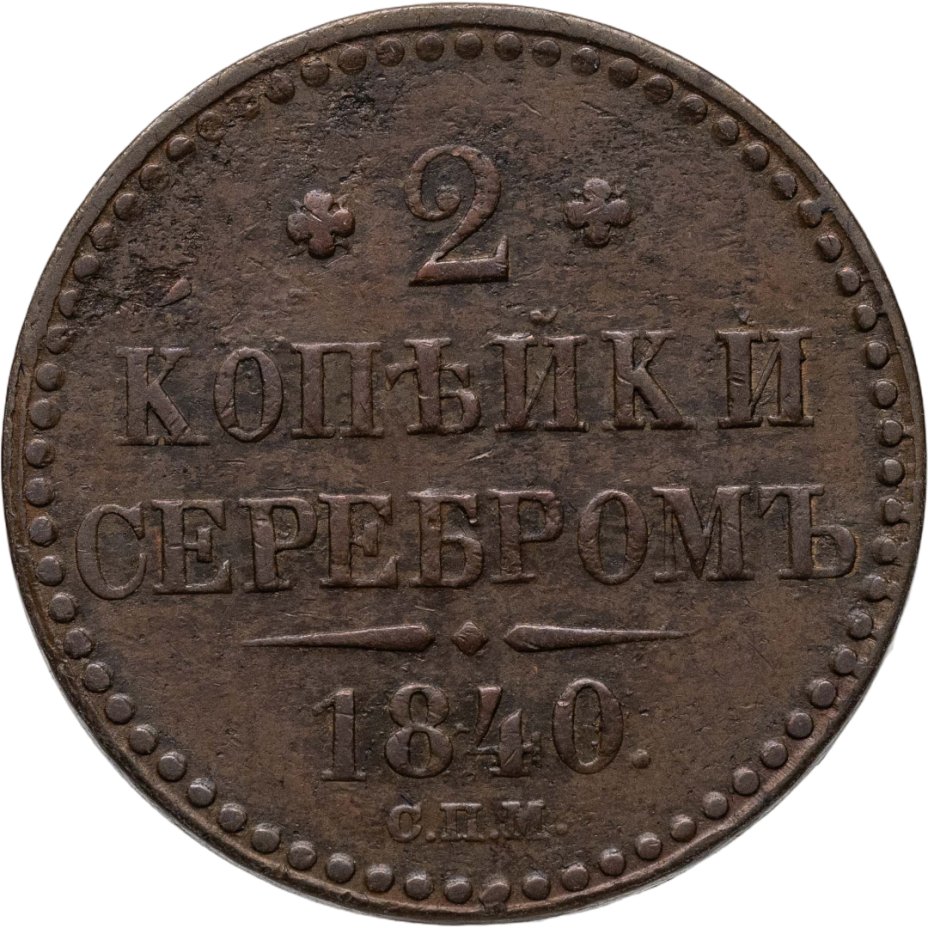 В центре надпись в две строки: «КОПѢЙКИ»│«СЕРЕБРОМЪ». Над надписью обозначение номинала — цифра «2», ограниченная с обеих сторон цветочными розетками. Под надписью расположен декоративный разделитель в виде двух фигурных линий и небольшим прямоугольным ромбом между ними. Под разделителем — год выпуска монеты «1840.». Ниже, обозначение монетного двора — буквы «С.П.М.». По окружности канта имеются рельефные элементы, выполненные в виде точек.