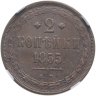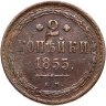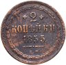 В центре указан номинал «2», ограниченный с обеих сторон цветочными розетками. Под цифрой номинала — слово "КОПЕЙКИ", под ним год выпуска монеты «1855.». Ниже, расположен декоративный разделитель в виде двух фигурных линий и небольшой точки между ними. Под разделителем обозначение монетного двора «Е.М.».