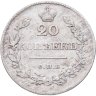 В центре указан номинал «20». Над цифрой – Корона Российской империи. Под цифрой номинала — слово "КОПЕЕК". Под словом - прямая черта, под ней - обозначение Санкт-Петербургского монетного двора «С.П.Б.». Вдоль канта, не доходя до короны, изображен венок из лавровой и дубовой ветви, которые в нижней части переплетены лентой. По окружности канта имеются рельефные элементы, выполненные в виде зубцов.