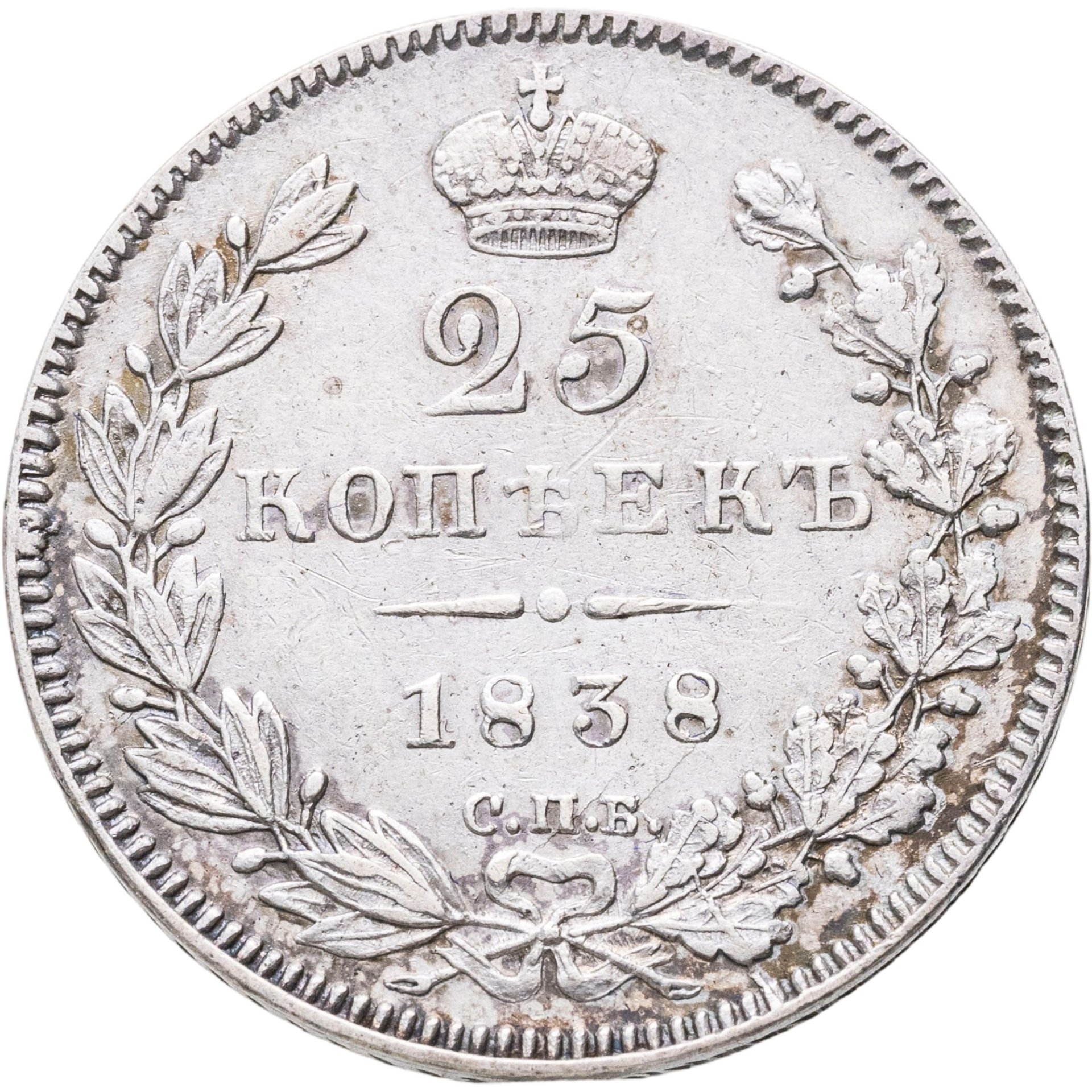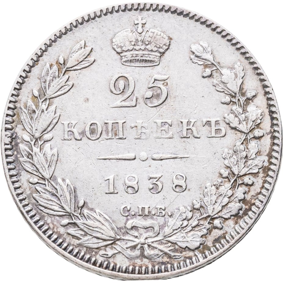 В центре указан номинал «25». Над цифрой – Корона Российской империи. Под цифрой номинала — слово "КОПЕЕК". Ниже, расположен декоративный разделитель в виде двух разнонаправленных фигурных линий и небольшой окружности между ними, в центре которой, выпуклая точка. Под разделителем — дата выпуска монеты «1838». Под цифрой даты — обозначение монетного двора «С.П.Б.». Вдоль канта, не доходя до короны, изображен венок из лавровой и дубовой ветви, которые в нижней части перевязаны лентой на узел бантом. По окружности канта имеются рельефные элементы, выполненные в виде зубцов.