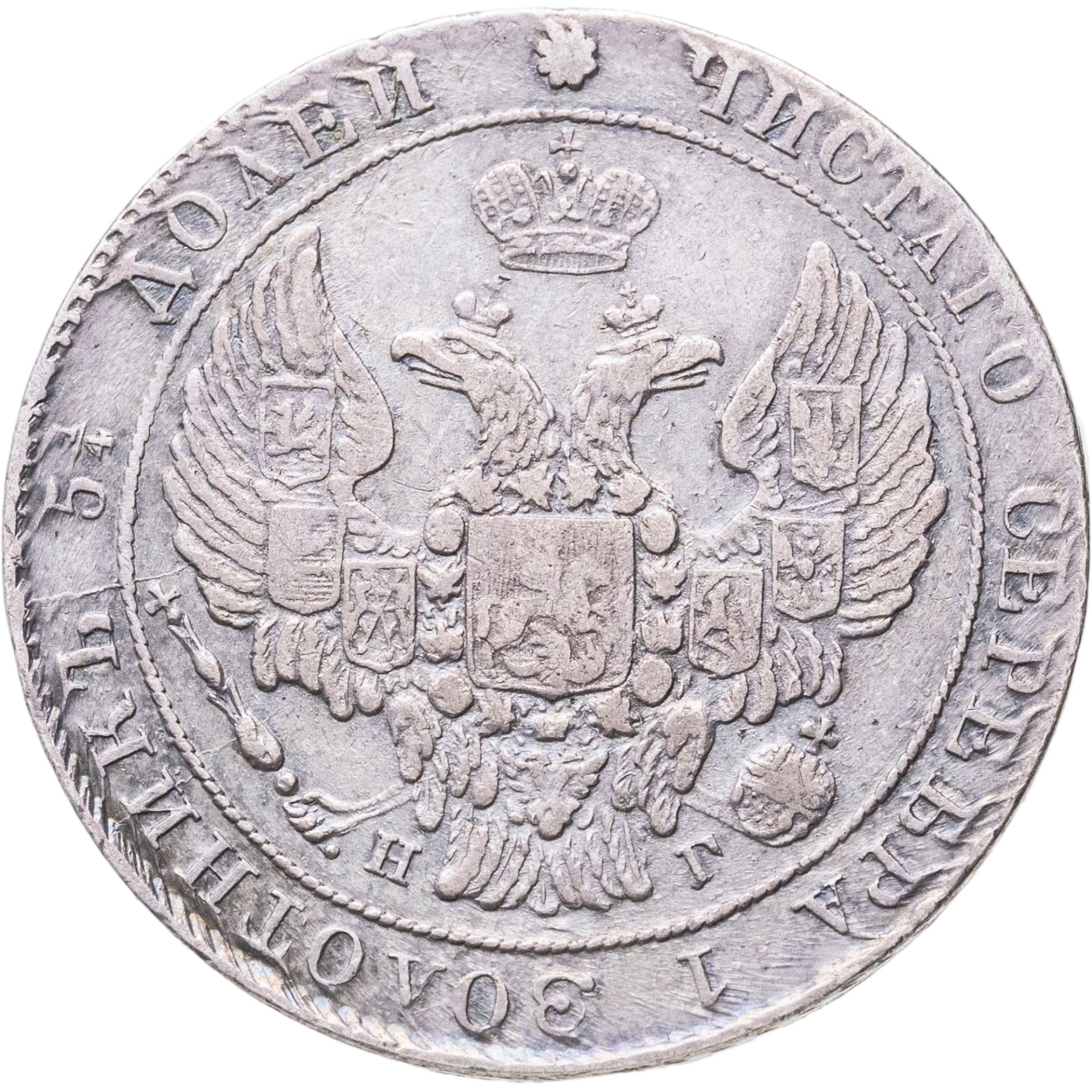 В центре изображен Государственный Герб Российской империи - двуглавый орёл, головы которого увенчаны двумя коронами, третья, большая корона над ними. На груди орла расположен Московский герб - щит с изображением Георгия Победоносца, поражающего копьем дракона. Вокруг щита орденская цепь с орденом Св. Апостола Андрея Первозванного. На крыльях изображены титульные гербы: на правом — Казанский, Астраханский и Сибирский, на левом — Польский, Таврический и Финляндский. В правой лапе орла – скипетр, в левой – держава. Под правой лапой – буква «Н», под левой – буква «Г». Инициалы минцмейстера Николая Грачева. Центральная часть отделена от остального изображения, окружностью в виде точек. За окружностью круговая надпись: «ЧИСТОГО СЕРЕБРА 1 ЗОЛОТНИК 5 1/4 ДОЛЕЙ», разделенная сверху цветочной розеткой. По окружности канта имеются рельефные элементы, выполненные в виде зубцов.