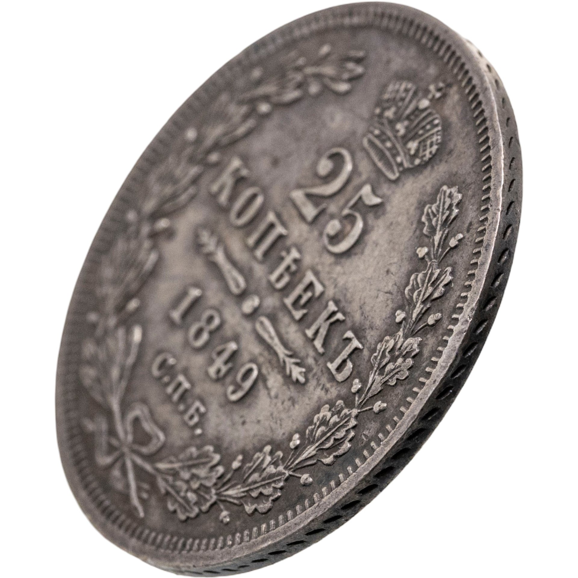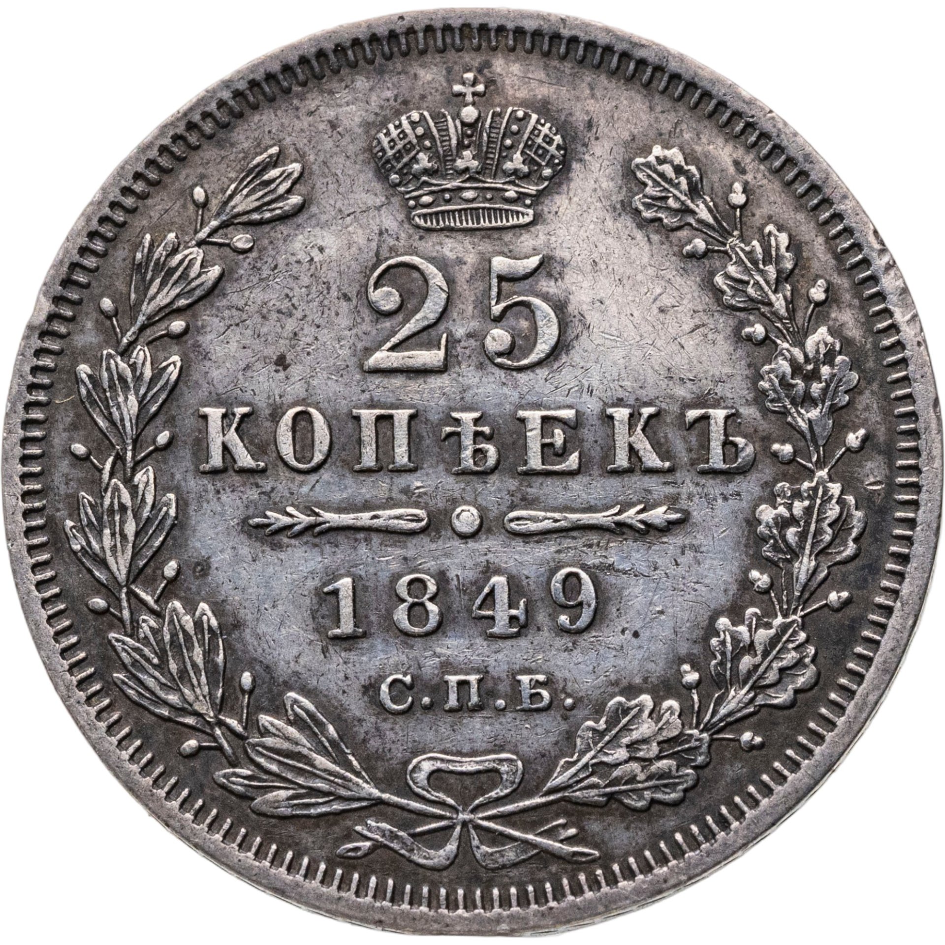 В центре указан номинал «25». Над цифрой – Корона Российской империи. Под цифрой номинала — слово "КОПЕЕК". Ниже, расположен декоративный разделитель в виде двух разнонаправленных фигурных линий и небольшой окружности между ними, в центре которой, выпуклая точка. Под разделителем — дата выпуска монеты «1849». Под цифрой даты — обозначение монетного двора «С.П.Б.». Вдоль канта, не доходя до короны, изображен венок из лавровой и дубовой ветви, которые в нижней части перевязаны лентой на узел бантом. По окружности канта имеются рельефные элементы, выполненные в виде зубцов.