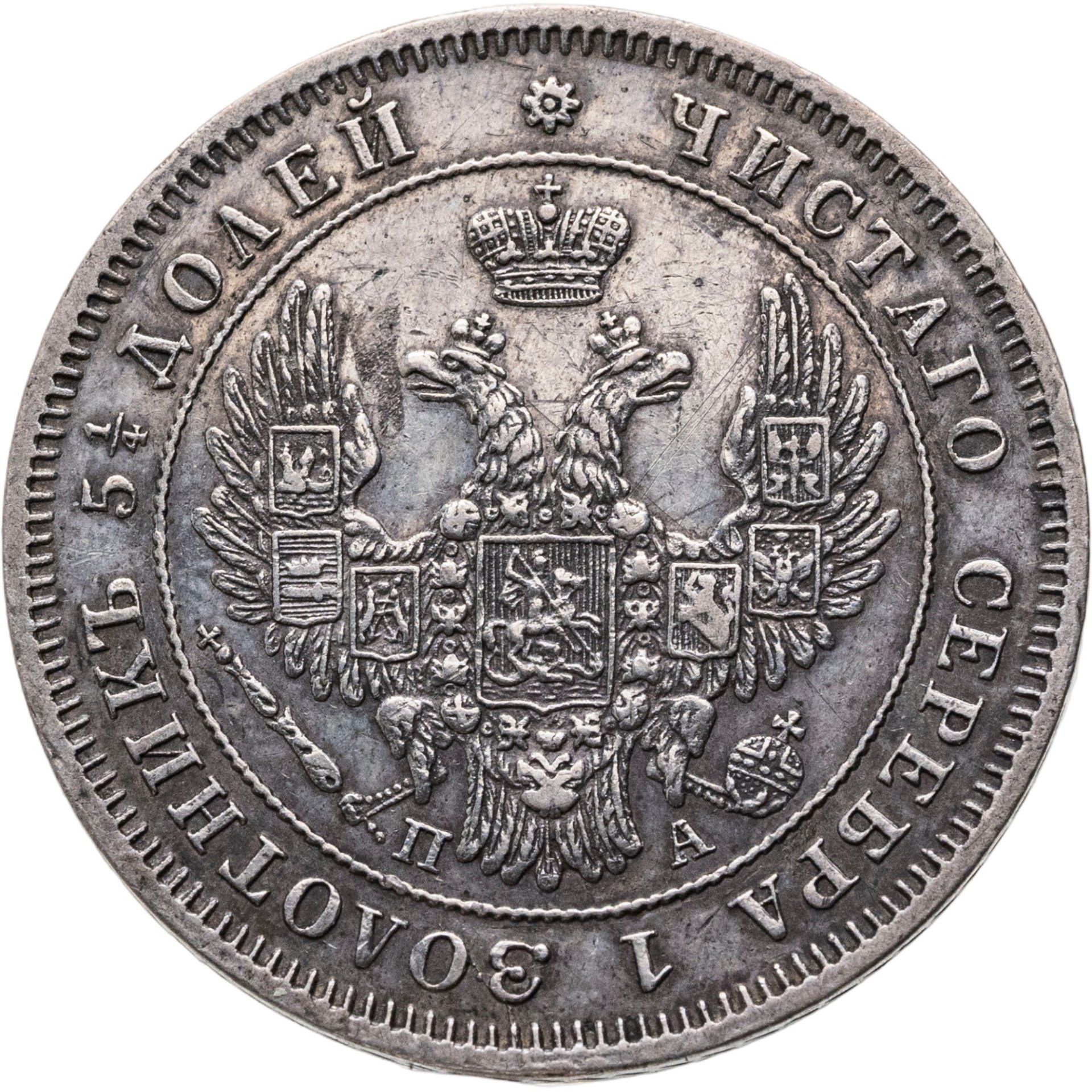 В центре изображен Государственный Герб Российской империи - двуглавый орёл, головы которого увенчаны двумя коронами, третья, большая корона над ними. На груди орла расположен Московский герб - щит с изображением Георгия Победоносца, поражающего копьем дракона. Вокруг щита орденская цепь с орденом Св. Апостола Андрея Первозванного. На крыльях изображены титульные гербы: на правом — Казанский, Астраханский и Сибирский, на левом — Польский, Таврический и Финляндский. В правой лапе орла – скипетр, в левой – держава. Под правой лапой – буква «П», под левой – буква «А». Инициалы минцмейстера Павла Алексеева. Центральная часть отделена от остального изображения, окружностью в виде точек. За окружностью круговая надпись: «ЧИСТОГО СЕРЕБРА 1 ЗОЛОТНИК 5 1/4 ДОЛЕЙ», разделенная сверху цветочной розеткой. По окружности канта имеются рельефные элементы, выполненные в виде зубцов.