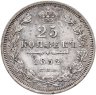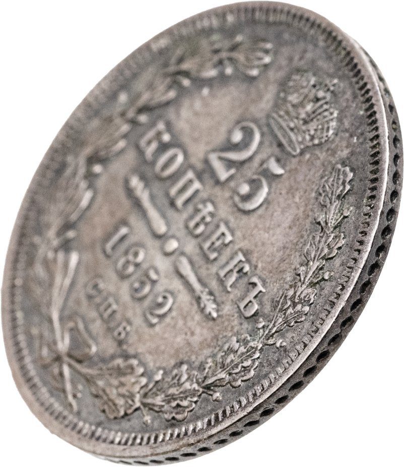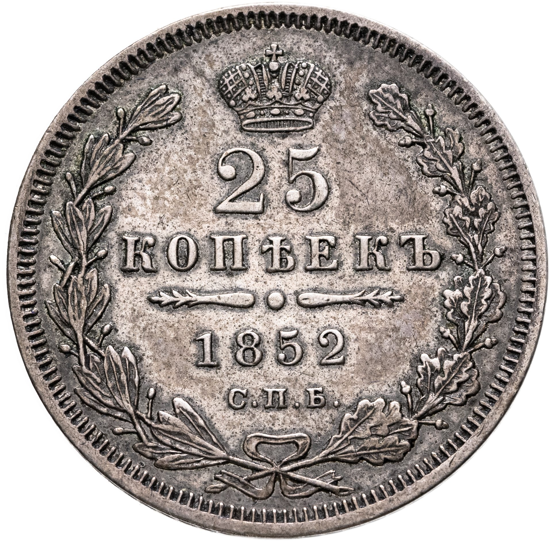 В центре указан номинал «25». Над цифрой – Корона Российской империи. Под цифрой номинала — слово "КОПЕЕК". Ниже, расположен декоративный разделитель в виде двух разнонаправленных фигурных линий и небольшой окружности между ними, в центре которой, выпуклая точка. Под разделителем — дата выпуска монеты «1852». Под цифрой даты — обозначение монетного двора «С.П.Б.». Вдоль канта, не доходя до короны, изображен венок из лавровой и дубовой ветви, которые в нижней части перевязаны лентой на узел бантом. По окружности канта имеются рельефные элементы, выполненные в виде зубцов.