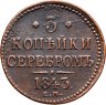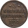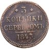 В центре надпись в две строки: «КОПѢЙКИ»│«СЕРЕБРОМЪ». Над надписью обозначение номинала — цифра «3», ограниченная с обеих сторон цветочными розетками. Под надписью расположен декоративный разделитель в виде двух фигурных линий и небольшой точки между ними. Под разделителем — год выпуска монеты «1843.». Ниже, обозначение монетного двора — буквы «Е.М.». По окружности канта имеются рельефные элементы, выполненные в виде точек.