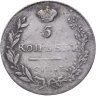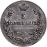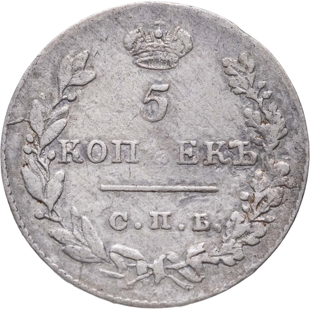 В центре указан номинал «5». Над цифрой – Корона Российской империи. Под цифрой номинала — слово "КОПЕЕК". Под словом - прямая черта, под ней - обозначение Санкт-Петербургского монетного двора «С.П.Б.». Вдоль канта, не доходя до короны, изображен венок из лавровой и дубовой ветви, которые в нижней части переплетены лентой. По окружности канта имеются рельефные элементы, выполненные в виде зубцов.