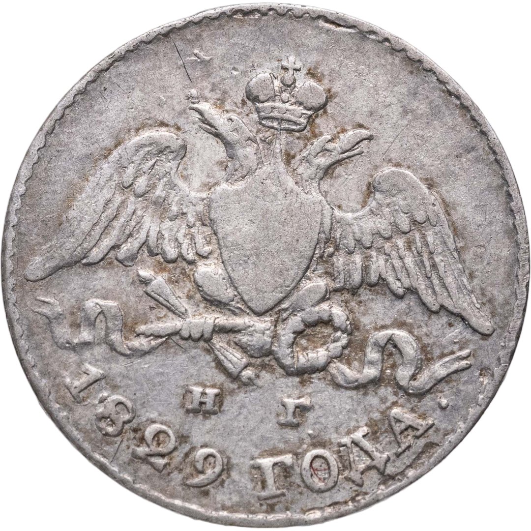 В центре изображен Государственный Герб Российской империи - двуглавый орёл с распростёртыми и опущенными вниз крыльями. На груди орла расположен Московский герб - щит с изображением Георгия Победоносца, поражающего копьем дракона. Гербовый щит, над головами орла, венчает императорская корона. Орёл держит, перевитые орденской лентой ордена Св. Апостола Андрея Первозванного, громовые стрелы и факел в правой лапе и лавровый венок — в левой. Под лентой буквы: слева «Н», справа «Г». Инициалы минцмейстера Николая Грачева. Под инициалами — дата выпуска монеты «1829 ГОДА.». По окружности канта имеются рельефные элементы, выполненные в виде зубцов.