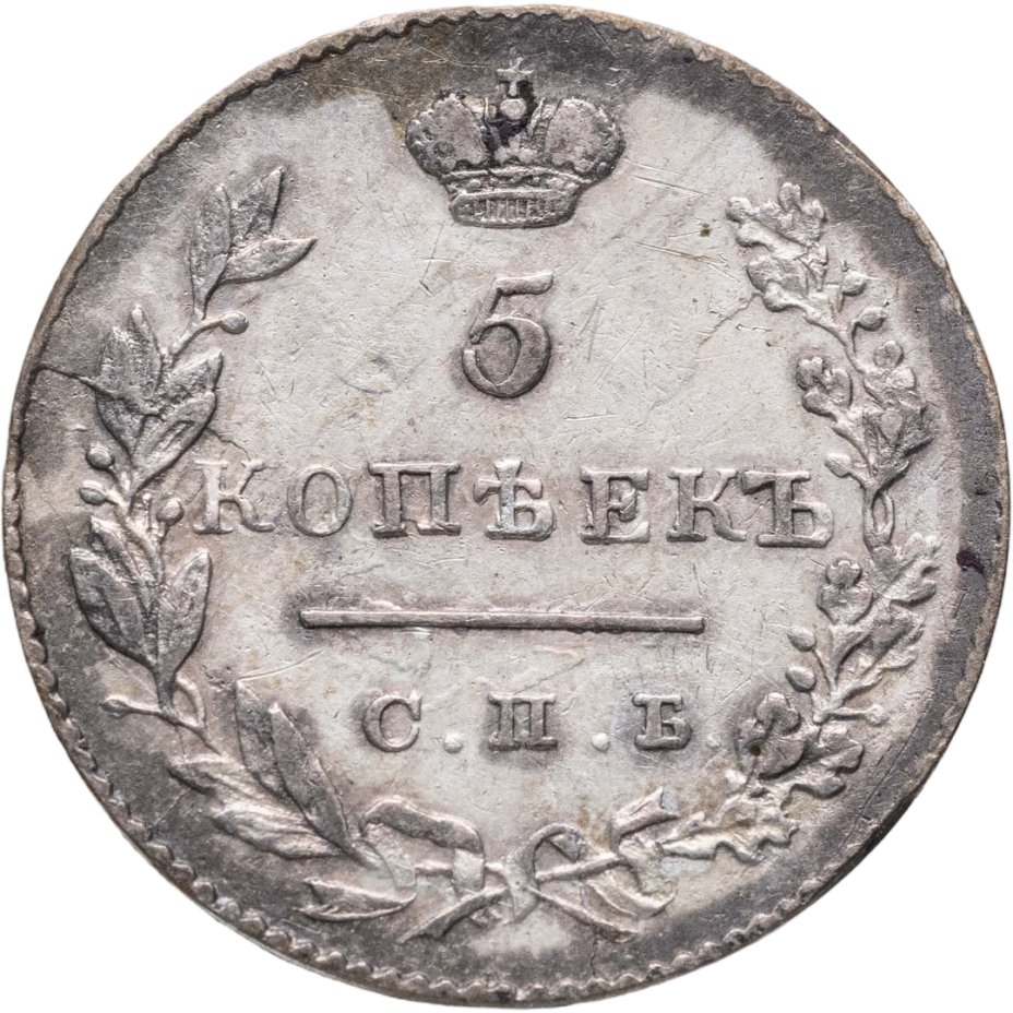 В центре указан номинал «5». Над цифрой – Корона Российской империи. Под цифрой номинала — слово "КОПЕЕК". Под словом - прямая черта, под ней - обозначение Санкт-Петербургского монетного двора «С.П.Б.». Вдоль канта, не доходя до короны, изображен венок из лавровой и дубовой ветви, которые в нижней части переплетены лентой. По окружности канта имеются рельефные элементы, выполненные в виде зубцов.
