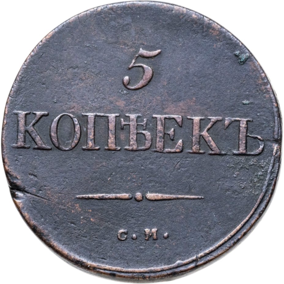 В центре указан номинал «5». Под цифрой номинала — слово "КОПЕЕК". Ниже, расположен декоративный разделитель в виде двух разнонаправленных линий и небольшой точки между ними. Ниже, под разделителем — обозначение монетного двора «С.М.».