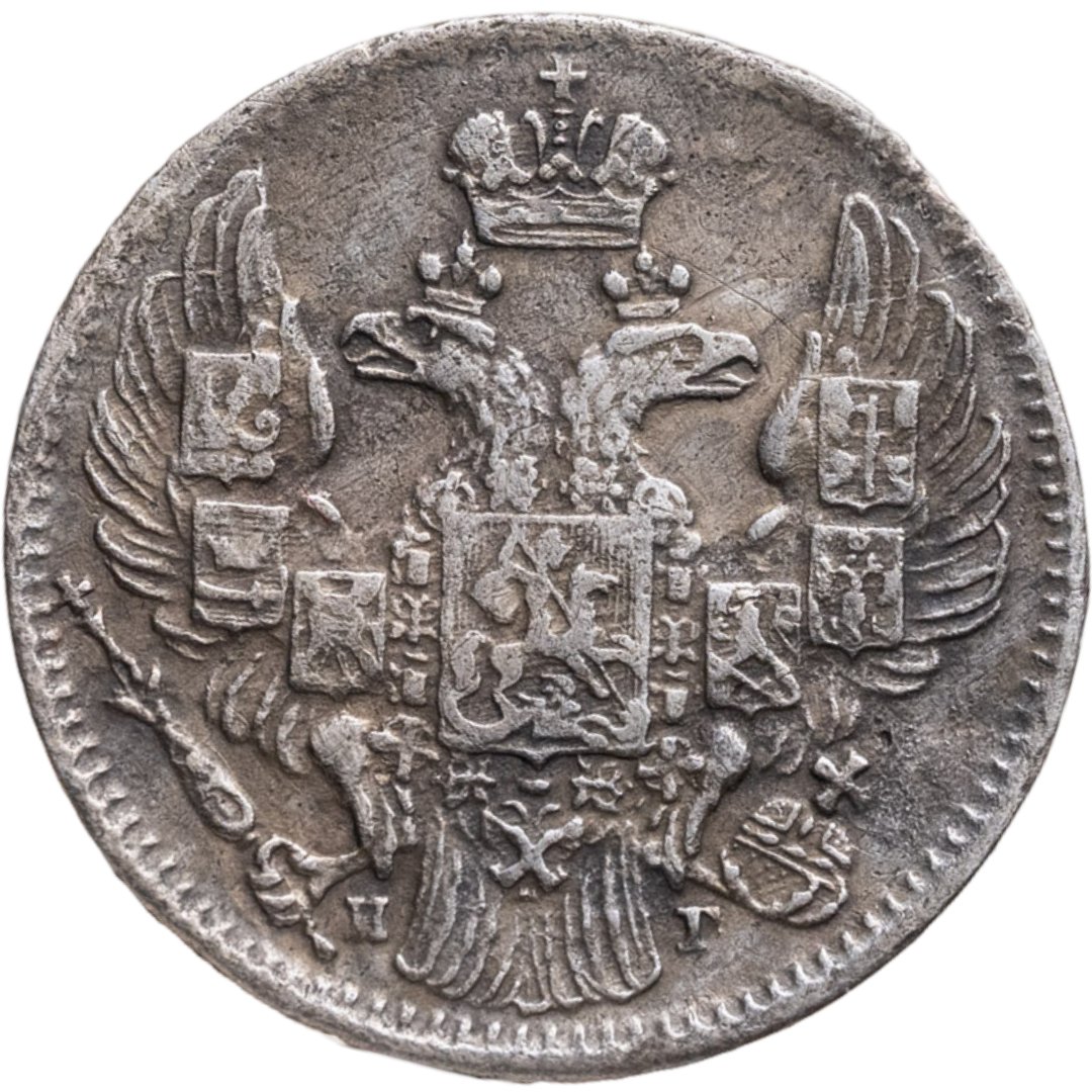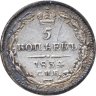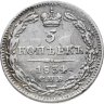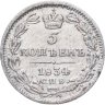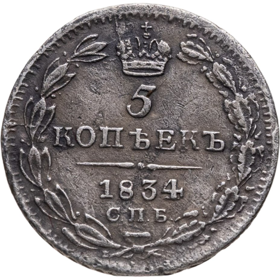 В центре указан номинал «5». Над цифрой – Корона Российской империи. Под цифрой номинала — слово "КОПЕЕК". Ниже, расположен декоративный разделитель в виде двух разнонаправленных фигурных линий и небольшой выпуклой точки между ними. Под разделителем — дата выпуска монеты «1834». Под цифрой даты — обозначение монетного двора «С.П.Б.». Вдоль канта, не доходя до короны, изображен венок из лавровой и дубовой ветви, которые в нижней части перевязаны лентой на узел бантом. По окружности канта имеются рельефные элементы, выполненные в виде зубцов.