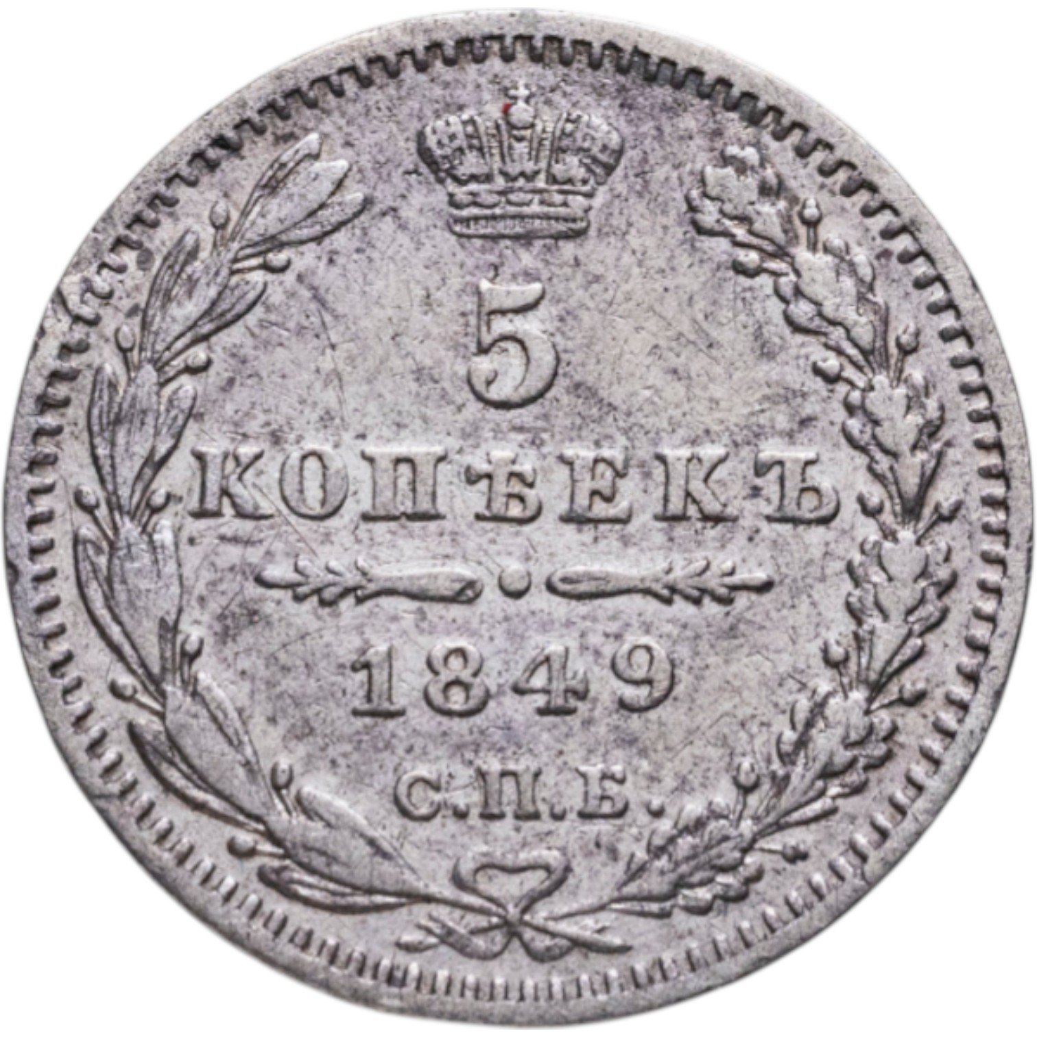 В центре указан номинал «5». Над цифрой – Корона Российской империи. Под цифрой номинала — слово "КОПЕЕК". Ниже, расположен декоративный разделитель в виде двух разнонаправленных фигурных линий и небольшой выпуклой точки между ними. Под разделителем — дата выпуска монеты «1849». Под цифрой даты — обозначение монетного двора «С.П.Б.». Вдоль канта, не доходя до короны, изображен венок из лавровой и дубовой ветви, которые в нижней части перевязаны лентой на узел бантом. По окружности канта имеются рельефные элементы, выполненные в виде зубцов.