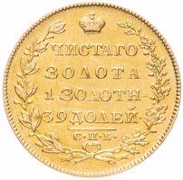 В центре надпись в четыре строки: «ЧИСТАГО»│«ЗОЛОТА»│«1 ЗОЛОТН=»│«39 ДОЛЕЙ». Над надписью - императорская корона. Под надписью - фигурная черта, под ней - обозначение Санкт-Петербургского монетного двора «С.П.Б.». Вдоль канта, не доходя до короны, изображен венок из лавровой и дубовой ветви, которые в нижней части перевязаны лентой на узел бантом. По окружности канта имеются рельефные элементы, выполненные в виде зубцов.