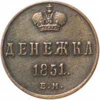 В центе обозначение номинала — слово «ДЕНЕЖКА». Выше номинала - Корона Российской империи. Ниже номинала — год выпуска монеты «1851.», под годом — обозначение монетного двора буквы «Е.М.».