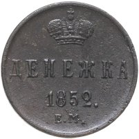 В центе обозначение номинала — слово «ДЕНЕЖКА». Выше номинала - Корона Российской империи. Ниже номинала — год выпуска монеты «1852.», под годом — обозначение монетного двора буквы «Е.М.».