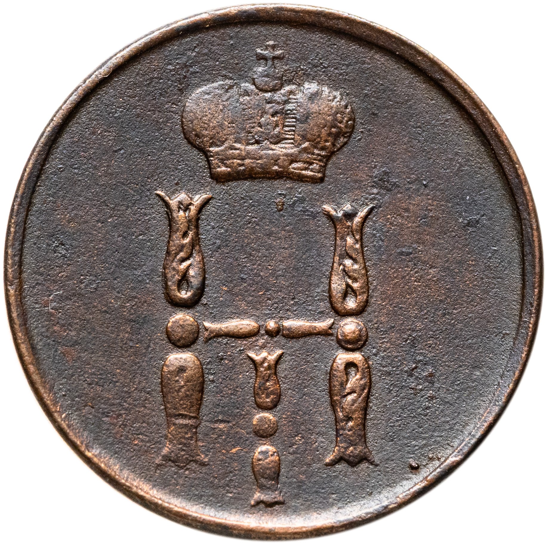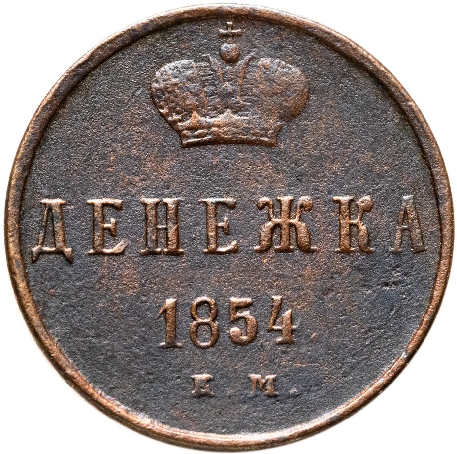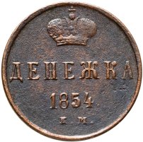 В центе обозначение номинала — слово «ДЕНЕЖКА». Выше номинала - Корона Российской империи. Ниже номинала — год выпуска монеты «1854.», под годом — обозначение монетного двора буквы «Е.М.».