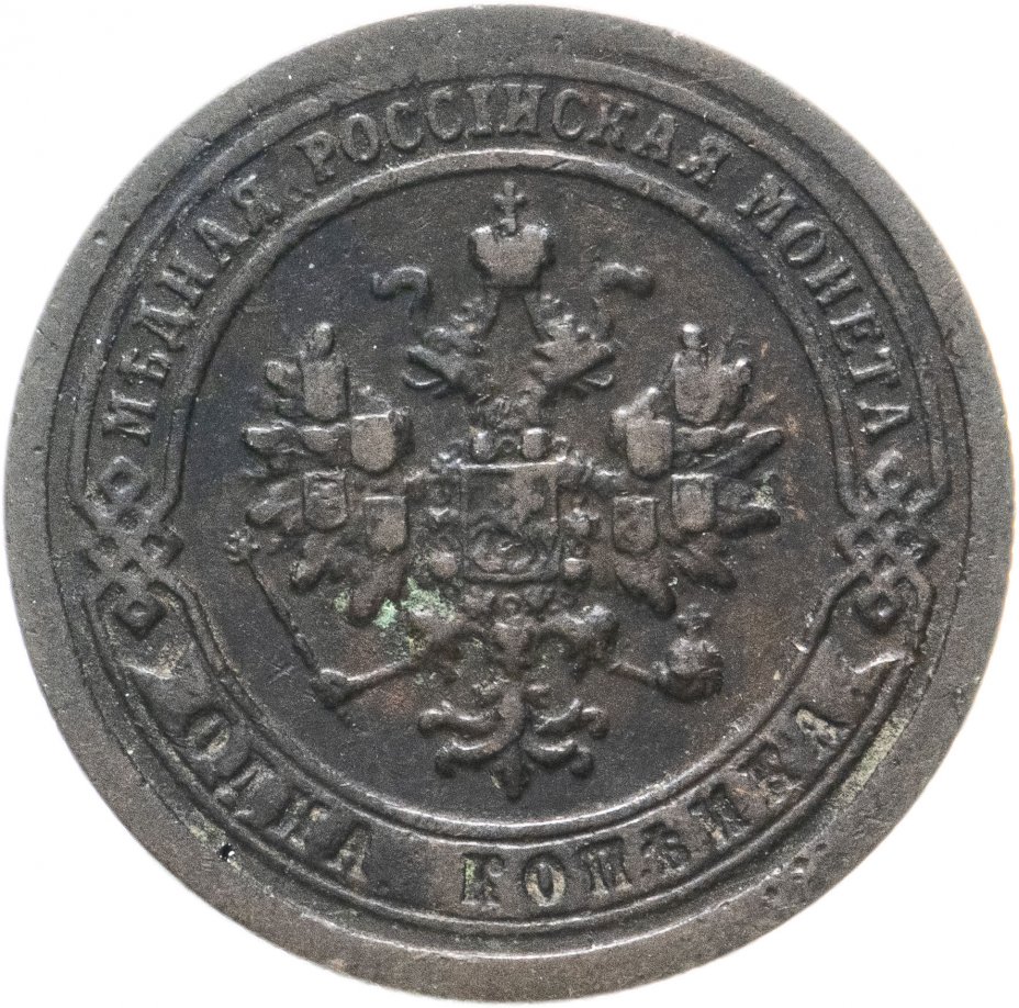 В центре монеты изображен Малый Государственный Герб Российской империи - двуглавый орел, головы которого увенчаны двумя коронами, третья, большая корона над ними. Все они соединены лентой Андрея Первозванного. В правой лапе орла – скипетр, в левой – держава. На его груди расположен Московский герб, в щите изображен Георгий Победоносец с копьем поражающий дракона. Вокруг щита цепь ордена Св. Апостола Андрея Первозванного. На крыльях орла изображены гербы: Царства Казанского, Польского, Херсонеса Таврического, Астраханского, Сибирского, Грузинского и герб соединенных княжеств Киевского, Новгородского и Владимирского — по 4 на каждое крыло. По окружности - две полукруглые плашки, соединенные узорами. На верхней плашке выпуклая надпись: "МЕДНАЯ РОССИЙСКАЯ МОНЕТА". На нижней плашке, изображенной в виде ленты, углубленная надпись: "ОДНА КОПЕЙКА".