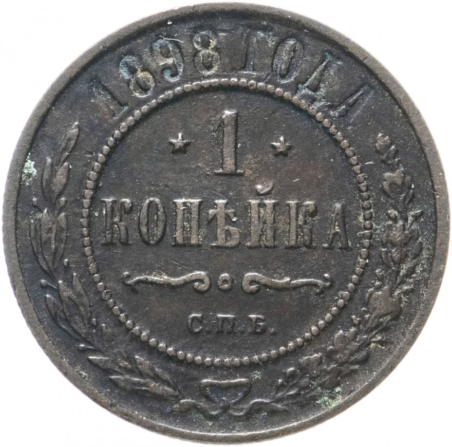 В центре указан номинал — цифра «1», ограниченная с обеих сторон звездочками. Под цифрой номинала — слово "КОПЕЙКА". Ниже, расположен декоративный разделитель в виде двух изогнутых линий и небольшой окружности между ними. Под разделителем — обозначение монетного двора «С.П.Б.». Центральная часть отделена от остального изображения, окружностью в виде точек. В верхней части полукругом углубленная надпись: "1898 ГОДА". Ниже этой надписи, вдоль канта, изображен венок из лавровой и дубовой ветвей, которые, в нижней части, перевязаны лентой на узел бантом.