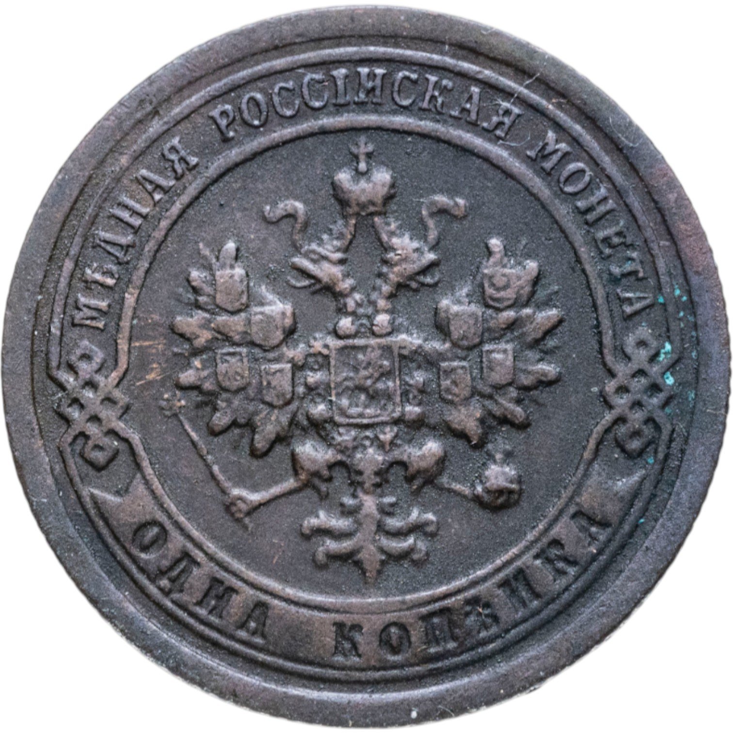 В центре монеты изображен Малый Государственный Герб Российской империи - двуглавый орел, головы которого увенчаны двумя коронами, третья, большая корона над ними. Все они соединены лентой Андрея Первозванного. В правой лапе орла – скипетр, в левой – держава. На его груди расположен Московский герб, в щите изображен Георгий Победоносец с копьем поражающий дракона. Вокруг щита цепь ордена Св. Апостола Андрея Первозванного. На крыльях орла изображены гербы: Царства Казанского, Польского, Херсонеса Таврического, Астраханского, Сибирского, Грузинского и герб соединенных княжеств Киевского, Новгородского и Владимирского — по 4 на каждое крыло. По окружности - две полукруглые плашки, соединенные узорами. На верхней плашке выпуклая надпись: "МЕДНАЯ РОССИЙСКАЯ МОНЕТА". На нижней плашке, изображенной в виде ленты, углубленная надпись: "ОДНА КОПЕЙКА".