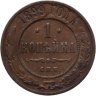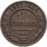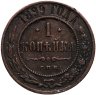 В центре монеты изображен Малый Государственный Герб Российской империи - двуглавый орел, головы которого увенчаны двумя коронами, третья, большая корона над ними. Все они соединены лентой Андрея Первозванного. В правой лапе орла – скипетр, в левой – держава. На его груди расположен Московский герб, в щите изображен Георгий Победоносец с копьем поражающий дракона. Вокруг щита цепь ордена Св. Апостола Андрея Первозванного. На крыльях орла изображены гербы: Царства Казанского, Польского, Херсонеса Таврического, Астраханского, Сибирского, Грузинского и герб соединенных княжеств Киевского, Новгородского и Владимирского — по 4 на каждое крыло. По окружности - две полукруглые плашки, соединенные узорами. На верхней плашке выпуклая надпись: "МЕДНАЯ РОССИЙСКАЯ МОНЕТА". На нижней плашке, изображенной в виде ленты, углубленная надпись: "ОДНА КОПЕЙКА".