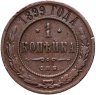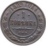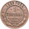 В центре указан номинал — цифра «1», ограниченная с обеих сторон звездочками. Под цифрой номинала — слово "КОПЕЙКА". Ниже, расположен декоративный разделитель в виде двух изогнутых линий и небольшой окружности между ними. Под разделителем — обозначение монетного двора «С.П.Б.». Центральная часть отделена от остального изображения, окружностью в виде точек. В верхней части полукругом углубленная надпись: "1899 ГОДА". Ниже этой надписи, вдоль канта, изображен венок из лавровой и дубовой ветвей, которые, в нижней части, перевязаны лентой на узел бантом.