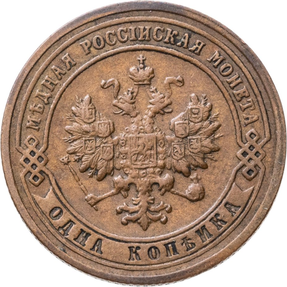 В центре монеты изображен Малый Государственный Герб Российской империи - двуглавый орел, головы которого увенчаны двумя коронами, третья, большая корона над ними. Все они соединены лентой Андрея Первозванного. В правой лапе орла – скипетр, в левой – держава. На его груди расположен Московский герб, в щите изображен Георгий Победоносец с копьем поражающий дракона. Вокруг щита цепь ордена Св. Апостола Андрея Первозванного. На крыльях орла изображены гербы: Царства Казанского, Польского, Херсонеса Таврического, Астраханского, Сибирского, Грузинского и герб соединенных княжеств Киевского, Новгородского и Владимирского — по 4 на каждое крыло. По окружности - две полукруглые плашки, соединенные узорами. На верхней плашке выпуклая надпись: "МЕДНАЯ РОССИЙСКАЯ МОНЕТА". На нижней плашке, изображенной в виде ленты, углубленная надпись: "ОДНА КОПЕЙКА".