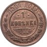 В центре указан номинал — цифра «1», ограниченная с обеих сторон звездочками. Под цифрой номинала — слово "КОПЕЙКА". Ниже, расположен декоративный разделитель в виде двух изогнутых линий и небольшой окружности между ними. Под разделителем — обозначение монетного двора «С.П.Б.». Центральная часть отделена от остального изображения, окружностью в виде точек. В верхней части полукругом углубленная надпись: "1901 ГОДА". Ниже этой надписи, вдоль канта, изображен венок из лавровой и дубовой ветвей, которые, в нижней части, перевязаны лентой на узел бантом.