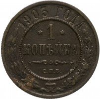 В центре указан номинал — цифра «1», ограниченная с обеих сторон звездочками. Под цифрой номинала — слово "КОПЕЙКА". Ниже, расположен декоративный разделитель в виде двух изогнутых линий и небольшой окружности между ними. Под разделителем — обозначение монетного двора «С.П.Б.». Центральная часть отделена от остального изображения, окружностью в виде точек. В верхней части полукругом углубленная надпись: "1903 ГОДА". Ниже этой надписи, вдоль канта, изображен венок из лавровой и дубовой ветвей, которые, в нижней части, перевязаны лентой на узел бантом.