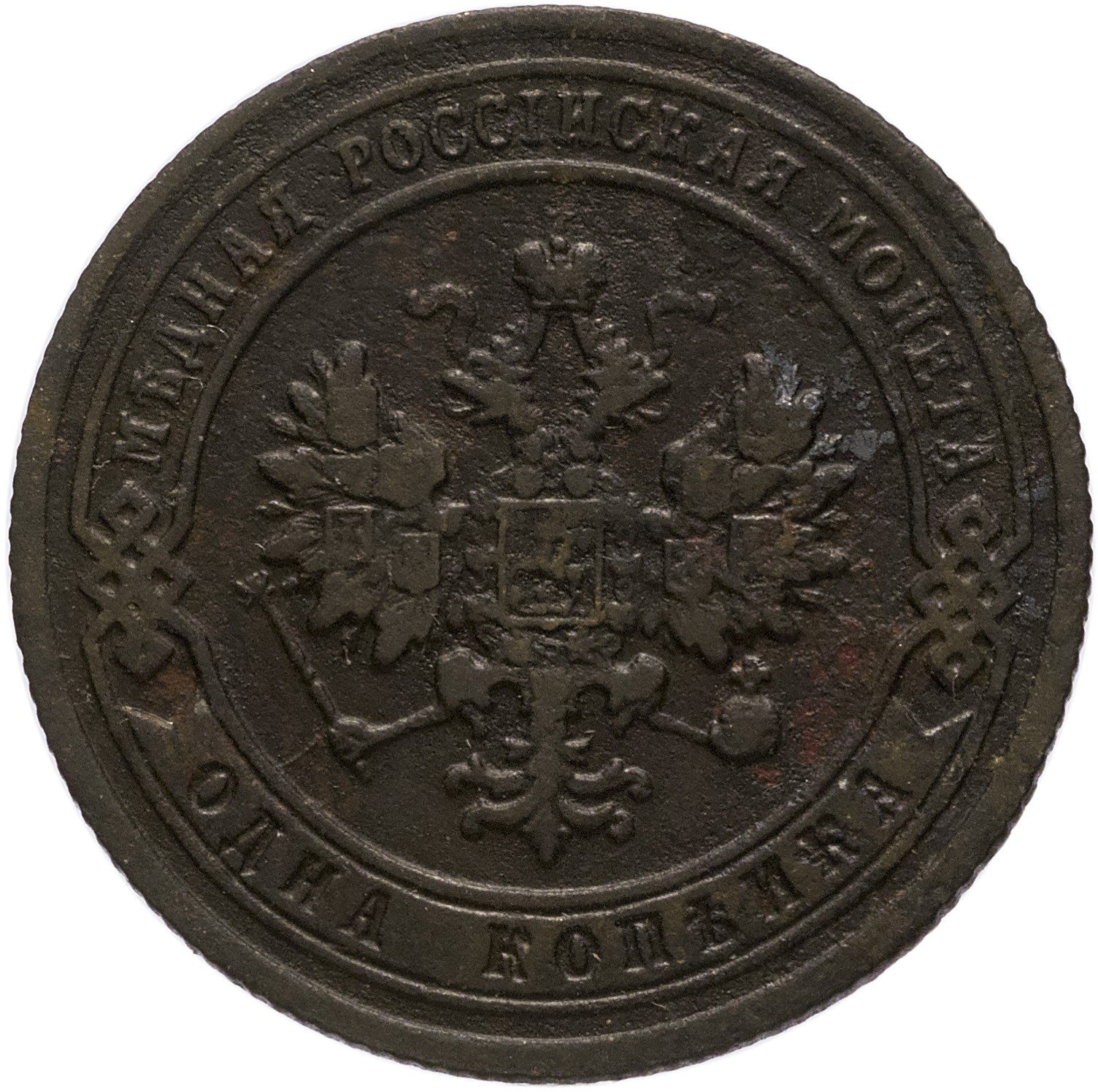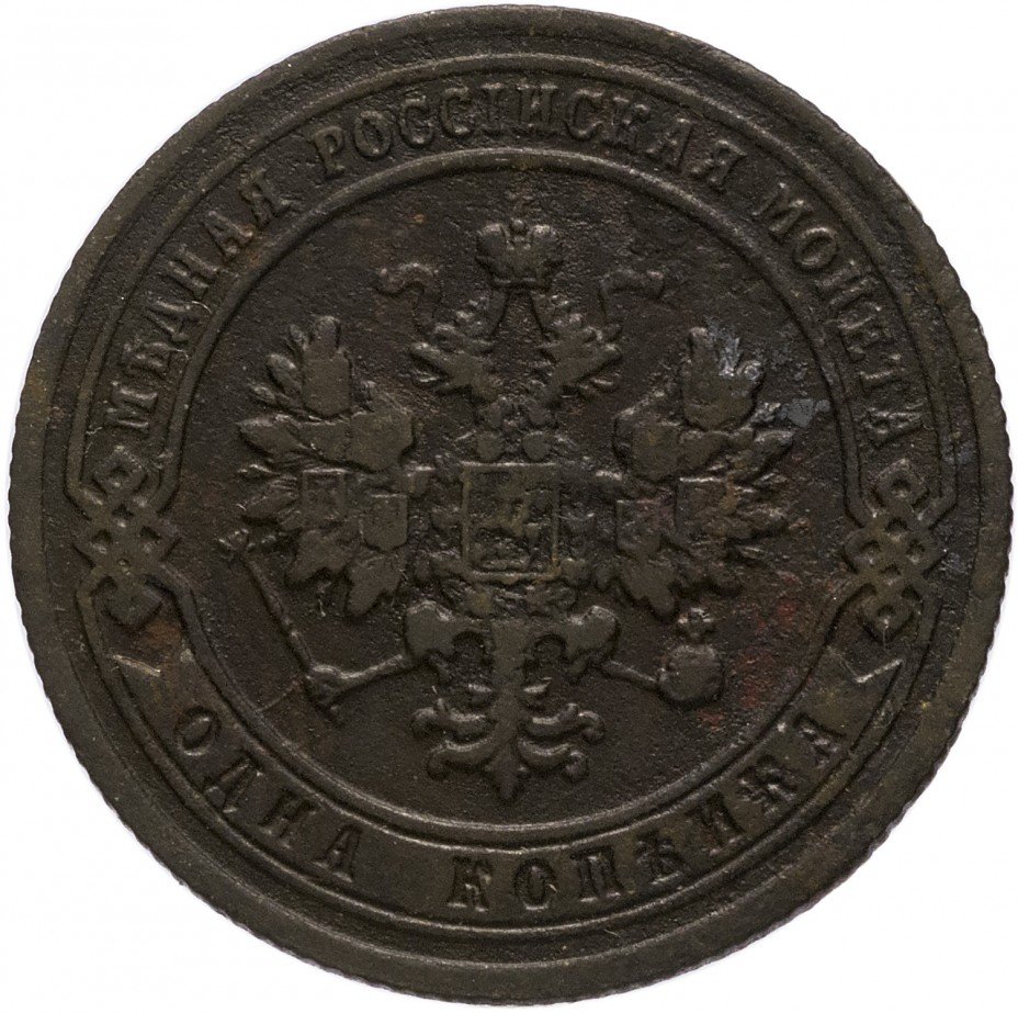В центре монеты изображен Малый Государственный Герб Российской империи - двуглавый орел, головы которого увенчаны двумя коронами, третья, большая корона над ними. Все они соединены лентой Андрея Первозванного. В правой лапе орла – скипетр, в левой – держава. На его груди расположен Московский герб, в щите изображен Георгий Победоносец с копьем поражающий дракона. Вокруг щита цепь ордена Св. Апостола Андрея Первозванного. На крыльях орла изображены гербы: Царства Казанского, Польского, Херсонеса Таврического, Астраханского, Сибирского, Грузинского и герб соединенных княжеств Киевского, Новгородского и Владимирского — по 4 на каждое крыло. По окружности - две полукруглые плашки, соединенные узорами. На верхней плашке выпуклая надпись: "МЕДНАЯ РОССИЙСКАЯ МОНЕТА". На нижней плашке, изображенной в виде ленты, углубленная надпись: "ОДНА КОПЕЙКА".