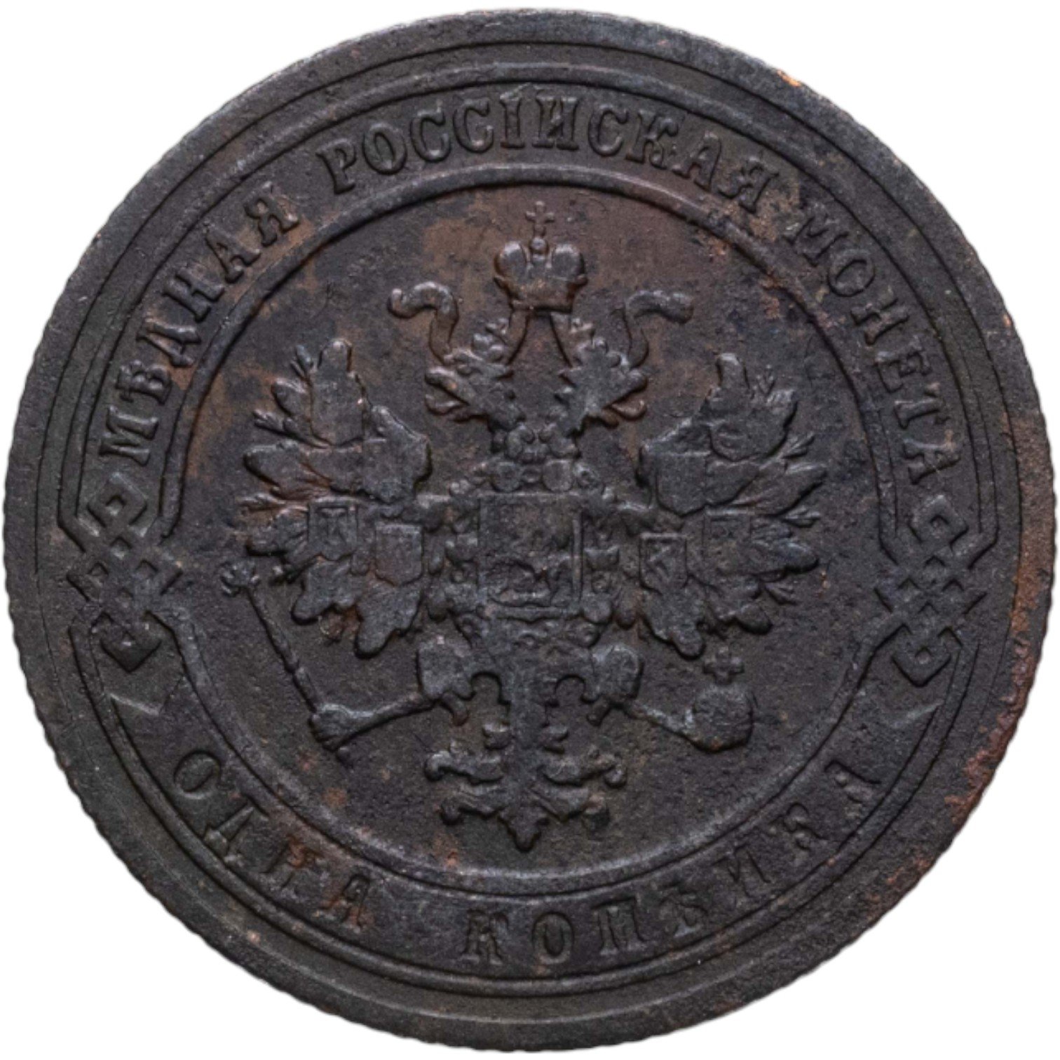 В центре монеты изображен Малый Государственный Герб Российской империи - двуглавый орел, головы которого увенчаны двумя коронами, третья, большая корона над ними. Все они соединены лентой Андрея Первозванного. В правой лапе орла – скипетр, в левой – держава. На его груди расположен Московский герб, в щите изображен Георгий Победоносец с копьем поражающий дракона. Вокруг щита цепь ордена Св. Апостола Андрея Первозванного. На крыльях орла изображены гербы: Царства Казанского, Польского, Херсонеса Таврического, Астраханского, Сибирского, Грузинского и герб соединенных княжеств Киевского, Новгородского и Владимирского — по 4 на каждое крыло. По окружности - две полукруглые плашки, соединенные узорами. На верхней плашке выпуклая надпись: "МЕДНАЯ РОССИЙСКАЯ МОНЕТА". На нижней плашке, изображенной в виде ленты, углубленная надпись: "ОДНА КОПЕЙКА".