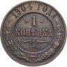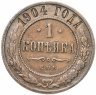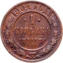 В центре указан номинал — цифра «1», ограниченная с обеих сторон звездочками. Под цифрой номинала — слово "КОПЕЙКА". Ниже, расположен декоративный разделитель в виде двух изогнутых линий и небольшой окружности между ними. Под разделителем — обозначение монетного двора «С.П.Б.». Центральная часть отделена от остального изображения, окружностью в виде точек. В верхней части полукругом углубленная надпись: "1904 ГОДА". Ниже этой надписи, вдоль канта, изображен венок из лавровой и дубовой ветвей, которые, в нижней части, перевязаны лентой на узел бантом.